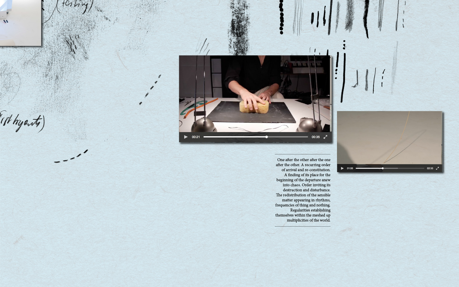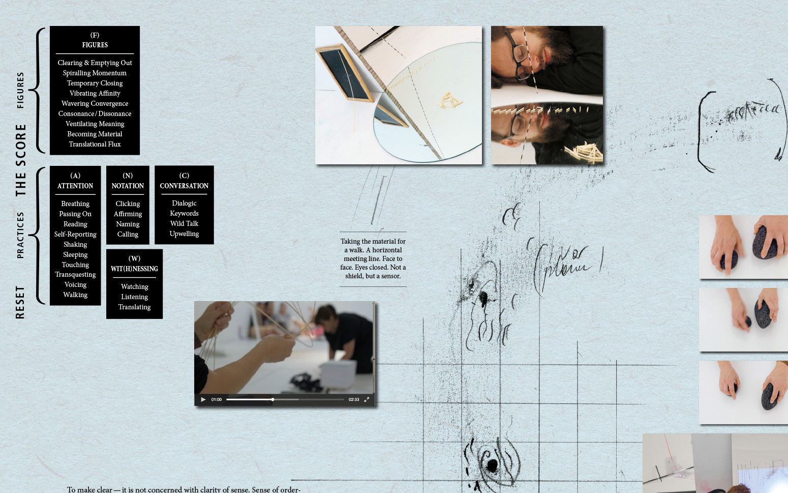We have developed this exposition for ‘scoring an aesthetic encounter’ with the multimodal (visual, textual, sonic, performative) findings from Choreo-graphic Figures: Deviations from the Line, an artistic research project by Emma Cocker, Nikolaus Gansterer and Mariella Greil. Choreo-graphic Figures stages a beyond-disciplinary encounter between the lines of choreography, drawing and writing, for exploring those forms of knowing-thinking-feeling produced in the slippage and deviation when different modes of practice enter into dialogue, overlap and collide. Within this exposition, our aim is not to present an exhaustive account of the Choreo-graphic Figures project. Rather, we seek to test the specificity of this online context for extending our investigation through the following questions: how can we create a digital archive capable of reflecting the durational and relational aspects of the research process, a mode of online dissemination that enacts something of the liveness or vitality — the energies and intensities — within collaborative live exploration? Beyond the limitations of the static two-dimensional page, how can an enhanced digital format enable a non-linear, rhizomatic encounter with artistic research, where findings are activated and navigated, interacted or even played with as a choreo-graphic event? We have modelled the exposition on the experimental score system developed within our research project, for organising our process of aesthetic enquiry through the bringing-into-relation of different practices and figures. The score is approached as a ‘research tool’ for testing how different practices (of Attention, Notation, Conversation, Wit(h)nessing) can be activated for sharpening, focusing or redirecting attention towards the event of figuring (those small yet transformative energies, emergences, and experiential shifts within artistic process that are often hard to discern but which ultimately steer the evolving action) and the emergence of figures (the point at which the experience of ‘something happening’ [i.e. figuring] coalesces into recognisable form). Within this exposition, our research can be encountered experientially through → Playing the Score, whilst the → Find Out More section contains contextual framing alongside conceptual-theoretical reflections on the function of our score and its ecology of practices and figures.