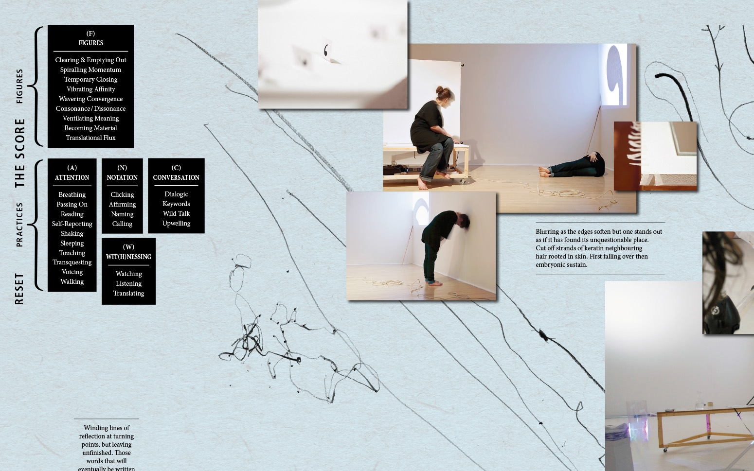 We have developed this exposition for ‘scoring an aesthetic encounter’ with the multimodal (visual, textual, sonic, performative) findings from Choreo-graphic Figures: Deviations from the Line, an artistic research project by Emma Cocker, Nikolaus Gansterer and Mariella Greil. Choreo-graphic Figures stages a beyond-disciplinary encounter between the lines of choreography, drawing and writing, for exploring those forms of knowing-thinking-feeling produced in the slippage and deviation when different modes of practice enter into dialogue, overlap and collide. Within this exposition, our aim is not to present an exhaustive account of the Choreo-graphic Figures project. Rather, we seek to test the specificity of this online context for extending our investigation through the following questions: how can we create a digital archive capable of reflecting the durational and relational aspects of the research process, a mode of online dissemination that enacts something of the liveness or vitality — the energies and intensities — within collaborative live exploration? Beyond the limitations of the static two-dimensional page, how can an enhanced digital format enable a non-linear, rhizomatic encounter with artistic research, where findings are activated and navigated, interacted or even played with as a choreo-graphic event? We have modelled the exposition on the experimental score system developed within our research project, for organising our process of aesthetic enquiry through the bringing-into-relation of different practices and figures. The score is approached as a ‘research tool’ for testing how different practices (of Attention, Notation, Conversation, Wit(h)nessing) can be activated for sharpening, focusing or redirecting attention towards the event of figuring (those small yet transformative energies, emergences, and experiential shifts within artistic process that are often hard to discern but which ultimately steer the evolving action) and the emergence of figures (the point at which the experience of ‘something happening’ [i.e. figuring] coalesces into recognisable form). Within this exposition, our research can be encountered experientially through → Playing the Score, whilst the → Find Out More section contains contextual framing alongside conceptual-theoretical reflections on the function of our score and its ecology of practices and figures.
