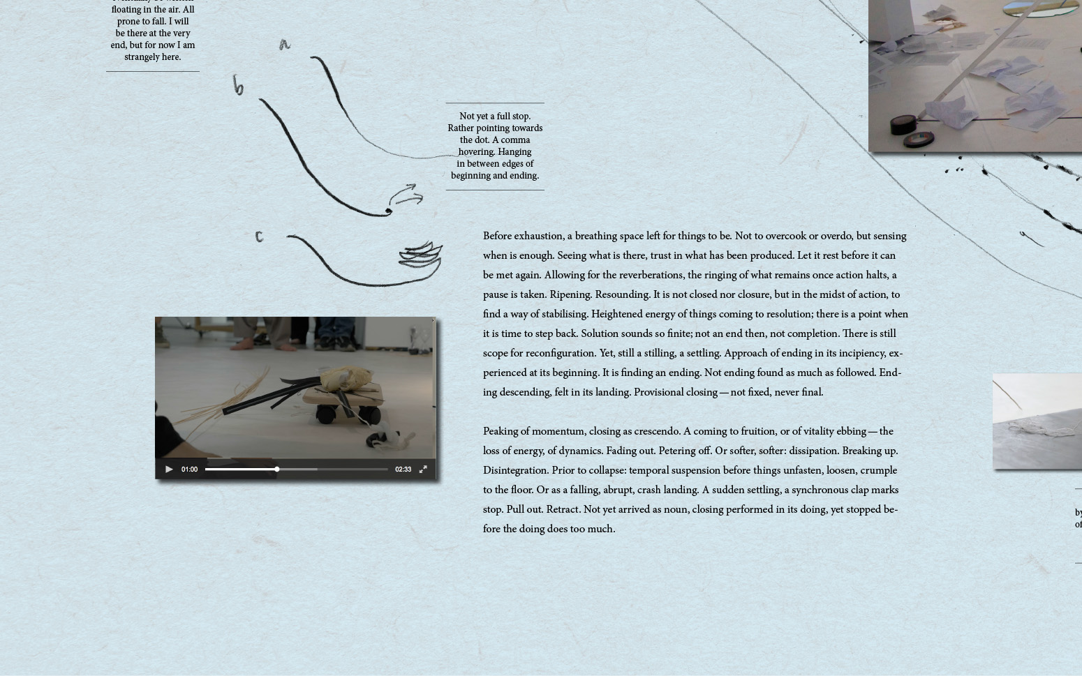 We have developed this exposition for ‘scoring an aesthetic encounter’ with the multimodal (visual, textual, sonic, performative) findings from Choreo-graphic Figures: Deviations from the Line, an artistic research project by Emma Cocker, Nikolaus Gansterer and Mariella Greil. Choreo-graphic Figures stages a beyond-disciplinary encounter between the lines of choreography, drawing and writing, for exploring those forms of knowing-thinking-feeling produced in the slippage and deviation when different modes of practice enter into dialogue, overlap and collide. Within this exposition, our aim is not to present an exhaustive account of the Choreo-graphic Figures project. Rather, we seek to test the specificity of this online context for extending our investigation through the following questions: how can we create a digital archive capable of reflecting the durational and relational aspects of the research process, a mode of online dissemination that enacts something of the liveness or vitality — the energies and intensities — within collaborative live exploration? Beyond the limitations of the static two-dimensional page, how can an enhanced digital format enable a non-linear, rhizomatic encounter with artistic research, where findings are activated and navigated, interacted or even played with as a choreo-graphic event? We have modelled the exposition on the experimental score system developed within our research project, for organising our process of aesthetic enquiry through the bringing-into-relation of different practices and figures. The score is approached as a ‘research tool’ for testing how different practices (of Attention, Notation, Conversation, Wit(h)nessing) can be activated for sharpening, focusing or redirecting attention towards the event of figuring (those small yet transformative energies, emergences, and experiential shifts within artistic process that are often hard to discern but which ultimately steer the evolving action) and the emergence of figures (the point at which the experience of ‘something happening’ [i.e. figuring] coalesces into recognisable form). Within this exposition, our research can be encountered experientially through → Playing the Score, whilst the → Find Out More section contains contextual framing alongside conceptual-theoretical reflections on the function of our score and its ecology of practices and figures.
