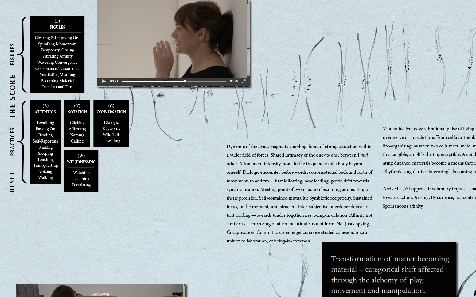 We have developed this exposition for ‘scoring an aesthetic encounter’ with the multimodal (visual, textual, sonic, performative) findings from Choreo-graphic Figures: Deviations from the Line, an artistic research project by Emma Cocker, Nikolaus Gansterer and Mariella Greil. Choreo-graphic Figures stages a beyond-disciplinary encounter between the lines of choreography, drawing and writing, for exploring those forms of knowing-thinking-feeling produced in the slippage and deviation when different modes of practice enter into dialogue, overlap and collide. Within this exposition, our aim is not to present an exhaustive account of the Choreo-graphic Figures project. Rather, we seek to test the specificity of this online context for extending our investigation through the following questions: how can we create a digital archive capable of reflecting the durational and relational aspects of the research process, a mode of online dissemination that enacts something of the liveness or vitality — the energies and intensities — within collaborative live exploration? Beyond the limitations of the static two-dimensional page, how can an enhanced digital format enable a non-linear, rhizomatic encounter with artistic research, where findings are activated and navigated, interacted or even played with as a choreo-graphic event? We have modelled the exposition on the experimental score system developed within our research project, for organising our process of aesthetic enquiry through the bringing-into-relation of different practices and figures. The score is approached as a ‘research tool’ for testing how different practices (of Attention, Notation, Conversation, Wit(h)nessing) can be activated for sharpening, focusing or redirecting attention towards the event of figuring (those small yet transformative energies, emergences, and experiential shifts within artistic process that are often hard to discern but which ultimately steer the evolving action) and the emergence of figures (the point at which the experience of ‘something happening’ [i.e. figuring] coalesces into recognisable form). Within this exposition, our research can be encountered experientially through → Playing the Score, whilst the → Find Out More section contains contextual framing alongside conceptual-theoretical reflections on the function of our score and its ecology of practices and figures.