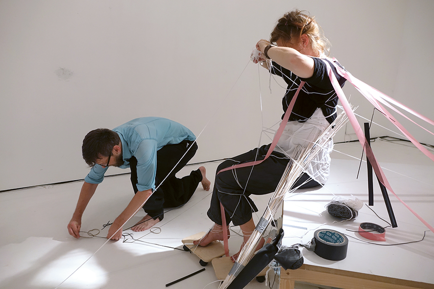 We have developed this exposition for ‘scoring an aesthetic encounter’ with the multimodal (visual, textual, sonic, performative) findings from Choreo-graphic Figures: Deviations from the Line, an artistic research project by Emma Cocker, Nikolaus Gansterer and Mariella Greil. Choreo-graphic Figures stages a beyond-disciplinary encounter between the lines of choreography, drawing and writing, for exploring those forms of knowing-thinking-feeling produced in the slippage and deviation when different modes of practice enter into dialogue, overlap and collide. Within this exposition, our aim is not to present an exhaustive account of the Choreo-graphic Figures project. Rather, we seek to test the specificity of this online context for extending our investigation through the following questions: how can we create a digital archive capable of reflecting the durational and relational aspects of the research process, a mode of online dissemination that enacts something of the liveness or vitality — the energies and intensities — within collaborative live exploration? Beyond the limitations of the static two-dimensional page, how can an enhanced digital format enable a non-linear, rhizomatic encounter with artistic research, where findings are activated and navigated, interacted or even played with as a choreo-graphic event? We have modelled the exposition on the experimental score system developed within our research project, for organising our process of aesthetic enquiry through the bringing-into-relation of different practices and figures. The score is approached as a ‘research tool’ for testing how different practices (of Attention, Notation, Conversation, Wit(h)nessing) can be activated for sharpening, focusing or redirecting attention towards the event of figuring (those small yet transformative energies, emergences, and experiential shifts within artistic process that are often hard to discern but which ultimately steer the evolving action) and the emergence of figures (the point at which the experience of ‘something happening’ [i.e. figuring] coalesces into recognisable form). Within this exposition, our research can be encountered experientially through → Playing the Score, whilst the → Find Out More section contains contextual framing alongside conceptual-theoretical reflections on the function of our score and its ecology of practices and figures.