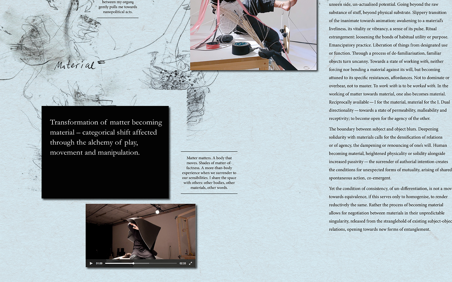 We have developed this exposition for ‘scoring an aesthetic encounter’ with the multimodal (visual, textual, sonic, performative) findings from Choreo-graphic Figures: Deviations from the Line, an artistic research project by Emma Cocker, Nikolaus Gansterer and Mariella Greil. Choreo-graphic Figures stages a beyond-disciplinary encounter between the lines of choreography, drawing and writing, for exploring those forms of knowing-thinking-feeling produced in the slippage and deviation when different modes of practice enter into dialogue, overlap and collide. Within this exposition, our aim is not to present an exhaustive account of the Choreo-graphic Figures project. Rather, we seek to test the specificity of this online context for extending our investigation through the following questions: how can we create a digital archive capable of reflecting the durational and relational aspects of the research process, a mode of online dissemination that enacts something of the liveness or vitality — the energies and intensities — within collaborative live exploration? Beyond the limitations of the static two-dimensional page, how can an enhanced digital format enable a non-linear, rhizomatic encounter with artistic research, where findings are activated and navigated, interacted or even played with as a choreo-graphic event? We have modelled the exposition on the experimental score system developed within our research project, for organising our process of aesthetic enquiry through the bringing-into-relation of different practices and figures. The score is approached as a ‘research tool’ for testing how different practices (of Attention, Notation, Conversation, Wit(h)nessing) can be activated for sharpening, focusing or redirecting attention towards the event of figuring (those small yet transformative energies, emergences, and experiential shifts within artistic process that are often hard to discern but which ultimately steer the evolving action) and the emergence of figures (the point at which the experience of ‘something happening’ [i.e. figuring] coalesces into recognisable form). Within this exposition, our research can be encountered experientially through → Playing the Score, whilst the → Find Out More section contains contextual framing alongside conceptual-theoretical reflections on the function of our score and its ecology of practices and figures.