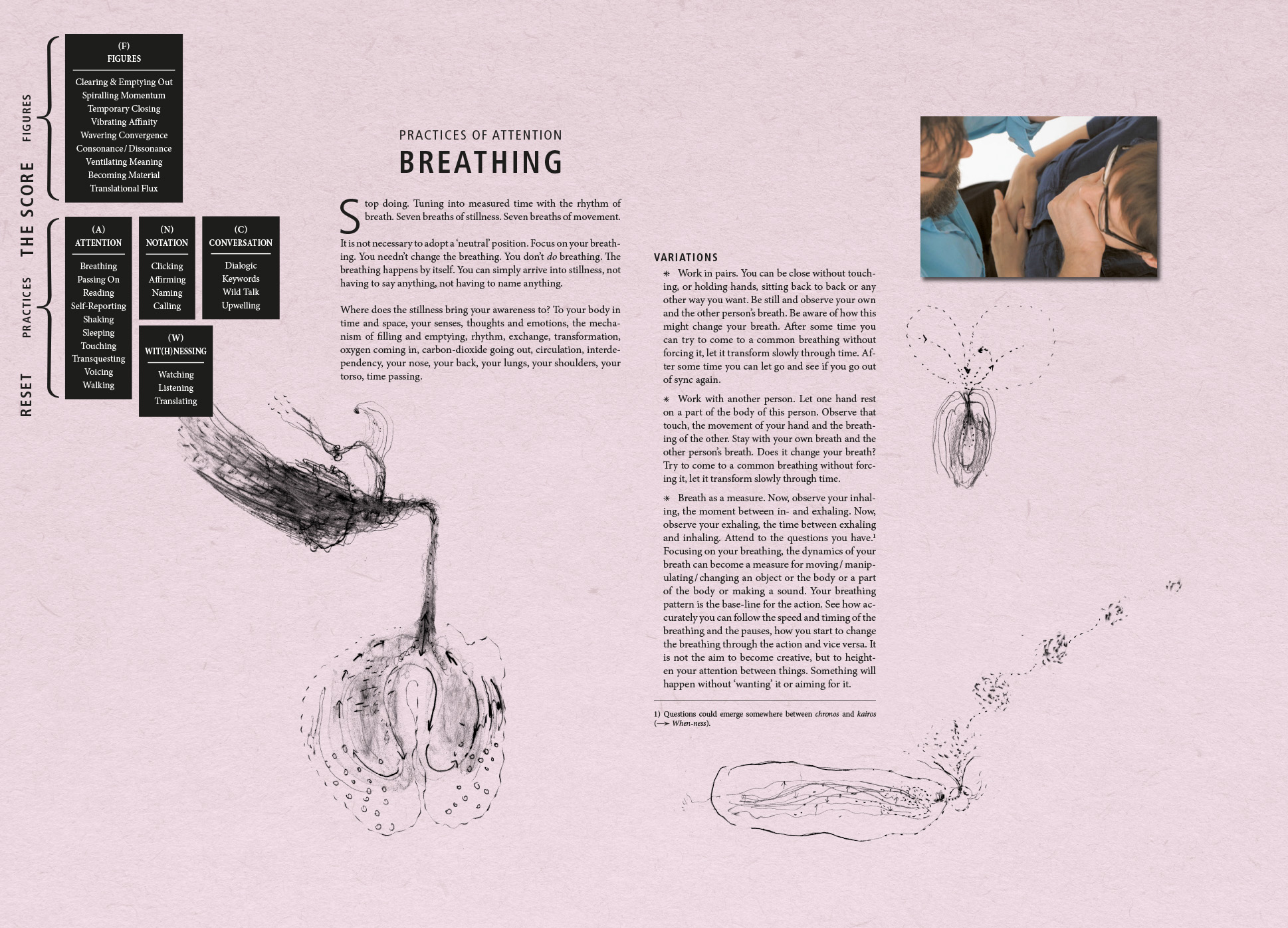 We have developed this exposition for ‘scoring an aesthetic encounter’ with the multimodal (visual, textual, sonic, performative) findings from Choreo-graphic Figures: Deviations from the Line, an artistic research project by Emma Cocker, Nikolaus Gansterer and Mariella Greil. Choreo-graphic Figures stages a beyond-disciplinary encounter between the lines of choreography, drawing and writing, for exploring those forms of knowing-thinking-feeling produced in the slippage and deviation when different modes of practice enter into dialogue, overlap and collide. Within this exposition, our aim is not to present an exhaustive account of the Choreo-graphic Figures project. Rather, we seek to test the specificity of this online context for extending our investigation through the following questions: how can we create a digital archive capable of reflecting the durational and relational aspects of the research process, a mode of online dissemination that enacts something of the liveness or vitality — the energies and intensities — within collaborative live exploration? Beyond the limitations of the static two-dimensional page, how can an enhanced digital format enable a non-linear, rhizomatic encounter with artistic research, where findings are activated and navigated, interacted or even played with as a choreo-graphic event? We have modelled the exposition on the experimental score system developed within our research project, for organising our process of aesthetic enquiry through the bringing-into-relation of different practices and figures. The score is approached as a ‘research tool’ for testing how different practices (of Attention, Notation, Conversation, Wit(h)nessing) can be activated for sharpening, focusing or redirecting attention towards the event of figuring (those small yet transformative energies, emergences, and experiential shifts within artistic process that are often hard to discern but which ultimately steer the evolving action) and the emergence of figures (the point at which the experience of ‘something happening’ [i.e. figuring] coalesces into recognisable form). Within this exposition, our research can be encountered experientially through → Playing the Score, whilst the → Find Out More section contains contextual framing alongside conceptual-theoretical reflections on the function of our score and its ecology of practices and figures.