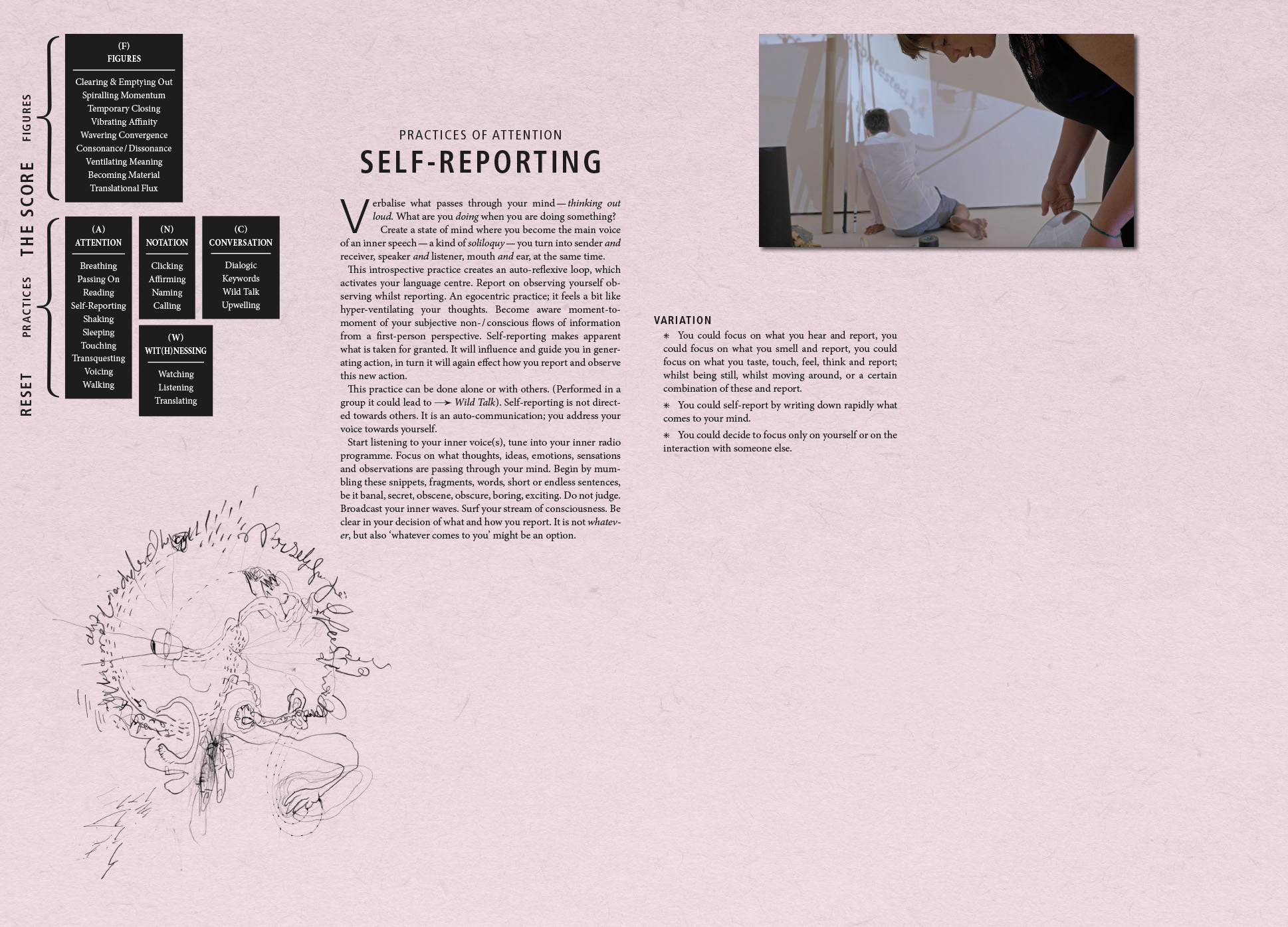 We have developed this exposition for ‘scoring an aesthetic encounter’ with the multimodal (visual, textual, sonic, performative) findings from Choreo-graphic Figures: Deviations from the Line, an artistic research project by Emma Cocker, Nikolaus Gansterer and Mariella Greil. Choreo-graphic Figures stages a beyond-disciplinary encounter between the lines of choreography, drawing and writing, for exploring those forms of knowing-thinking-feeling produced in the slippage and deviation when different modes of practice enter into dialogue, overlap and collide. Within this exposition, our aim is not to present an exhaustive account of the Choreo-graphic Figures project. Rather, we seek to test the specificity of this online context for extending our investigation through the following questions: how can we create a digital archive capable of reflecting the durational and relational aspects of the research process, a mode of online dissemination that enacts something of the liveness or vitality — the energies and intensities — within collaborative live exploration? Beyond the limitations of the static two-dimensional page, how can an enhanced digital format enable a non-linear, rhizomatic encounter with artistic research, where findings are activated and navigated, interacted or even played with as a choreo-graphic event? We have modelled the exposition on the experimental score system developed within our research project, for organising our process of aesthetic enquiry through the bringing-into-relation of different practices and figures. The score is approached as a ‘research tool’ for testing how different practices (of Attention, Notation, Conversation, Wit(h)nessing) can be activated for sharpening, focusing or redirecting attention towards the event of figuring (those small yet transformative energies, emergences, and experiential shifts within artistic process that are often hard to discern but which ultimately steer the evolving action) and the emergence of figures (the point at which the experience of ‘something happening’ [i.e. figuring] coalesces into recognisable form). Within this exposition, our research can be encountered experientially through → Playing the Score, whilst the → Find Out More section contains contextual framing alongside conceptual-theoretical reflections on the function of our score and its ecology of practices and figures.