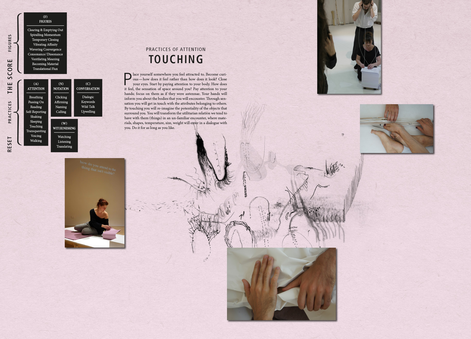 We have developed this exposition for ‘scoring an aesthetic encounter’ with the multimodal (visual, textual, sonic, performative) findings from Choreo-graphic Figures: Deviations from the Line, an artistic research project by Emma Cocker, Nikolaus Gansterer and Mariella Greil. Choreo-graphic Figures stages a beyond-disciplinary encounter between the lines of choreography, drawing and writing, for exploring those forms of knowing-thinking-feeling produced in the slippage and deviation when different modes of practice enter into dialogue, overlap and collide. Within this exposition, our aim is not to present an exhaustive account of the Choreo-graphic Figures project. Rather, we seek to test the specificity of this online context for extending our investigation through the following questions: how can we create a digital archive capable of reflecting the durational and relational aspects of the research process, a mode of online dissemination that enacts something of the liveness or vitality — the energies and intensities — within collaborative live exploration? Beyond the limitations of the static two-dimensional page, how can an enhanced digital format enable a non-linear, rhizomatic encounter with artistic research, where findings are activated and navigated, interacted or even played with as a choreo-graphic event? We have modelled the exposition on the experimental score system developed within our research project, for organising our process of aesthetic enquiry through the bringing-into-relation of different practices and figures. The score is approached as a ‘research tool’ for testing how different practices (of Attention, Notation, Conversation, Wit(h)nessing) can be activated for sharpening, focusing or redirecting attention towards the event of figuring (those small yet transformative energies, emergences, and experiential shifts within artistic process that are often hard to discern but which ultimately steer the evolving action) and the emergence of figures (the point at which the experience of ‘something happening’ [i.e. figuring] coalesces into recognisable form). Within this exposition, our research can be encountered experientially through → Playing the Score, whilst the → Find Out More section contains contextual framing alongside conceptual-theoretical reflections on the function of our score and its ecology of practices and figures.