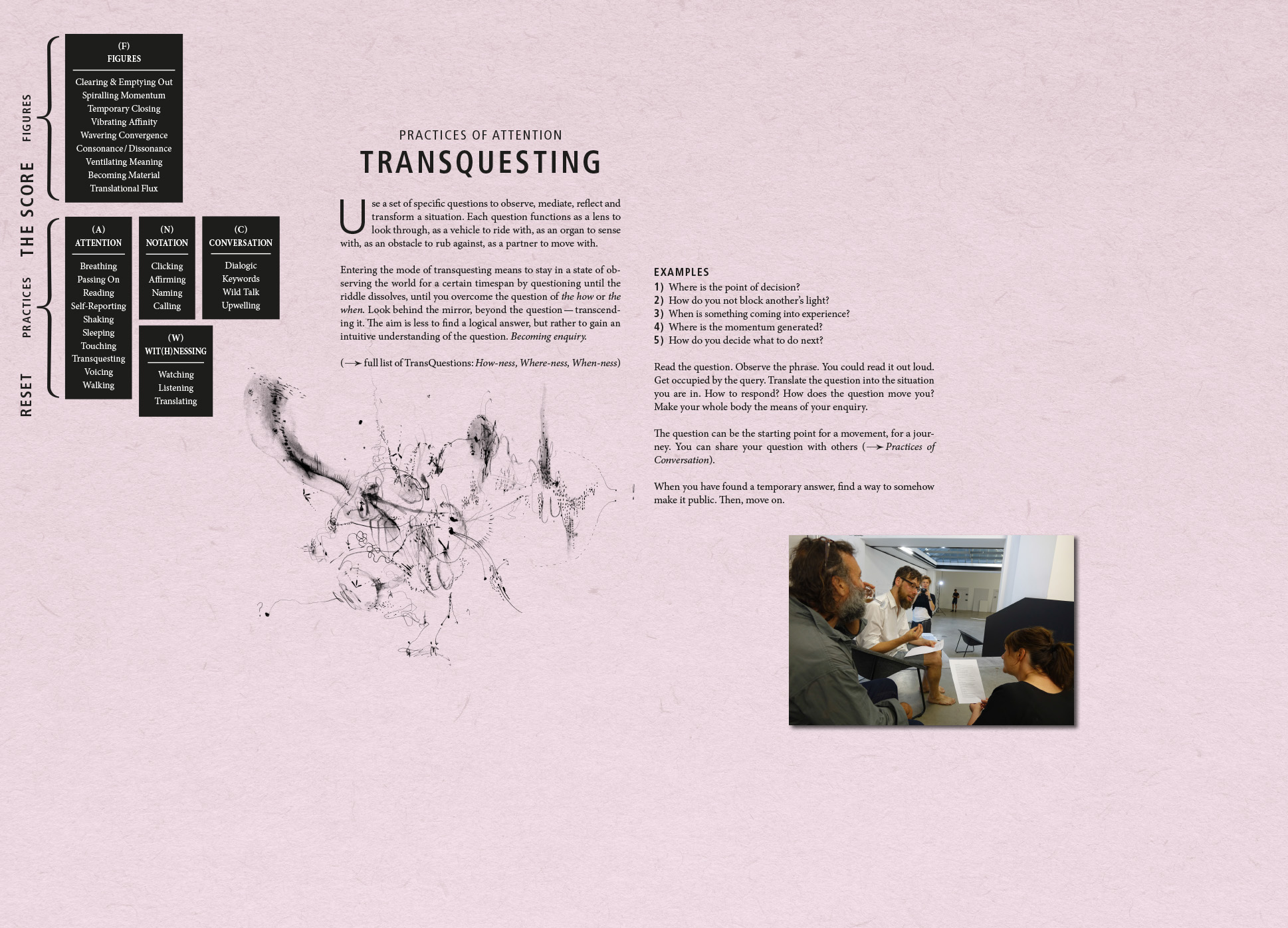 We have developed this exposition for ‘scoring an aesthetic encounter’ with the multimodal (visual, textual, sonic, performative) findings from Choreo-graphic Figures: Deviations from the Line, an artistic research project by Emma Cocker, Nikolaus Gansterer and Mariella Greil. Choreo-graphic Figures stages a beyond-disciplinary encounter between the lines of choreography, drawing and writing, for exploring those forms of knowing-thinking-feeling produced in the slippage and deviation when different modes of practice enter into dialogue, overlap and collide. Within this exposition, our aim is not to present an exhaustive account of the Choreo-graphic Figures project. Rather, we seek to test the specificity of this online context for extending our investigation through the following questions: how can we create a digital archive capable of reflecting the durational and relational aspects of the research process, a mode of online dissemination that enacts something of the liveness or vitality — the energies and intensities — within collaborative live exploration? Beyond the limitations of the static two-dimensional page, how can an enhanced digital format enable a non-linear, rhizomatic encounter with artistic research, where findings are activated and navigated, interacted or even played with as a choreo-graphic event? We have modelled the exposition on the experimental score system developed within our research project, for organising our process of aesthetic enquiry through the bringing-into-relation of different practices and figures. The score is approached as a ‘research tool’ for testing how different practices (of Attention, Notation, Conversation, Wit(h)nessing) can be activated for sharpening, focusing or redirecting attention towards the event of figuring (those small yet transformative energies, emergences, and experiential shifts within artistic process that are often hard to discern but which ultimately steer the evolving action) and the emergence of figures (the point at which the experience of ‘something happening’ [i.e. figuring] coalesces into recognisable form). Within this exposition, our research can be encountered experientially through → Playing the Score, whilst the → Find Out More section contains contextual framing alongside conceptual-theoretical reflections on the function of our score and its ecology of practices and figures.