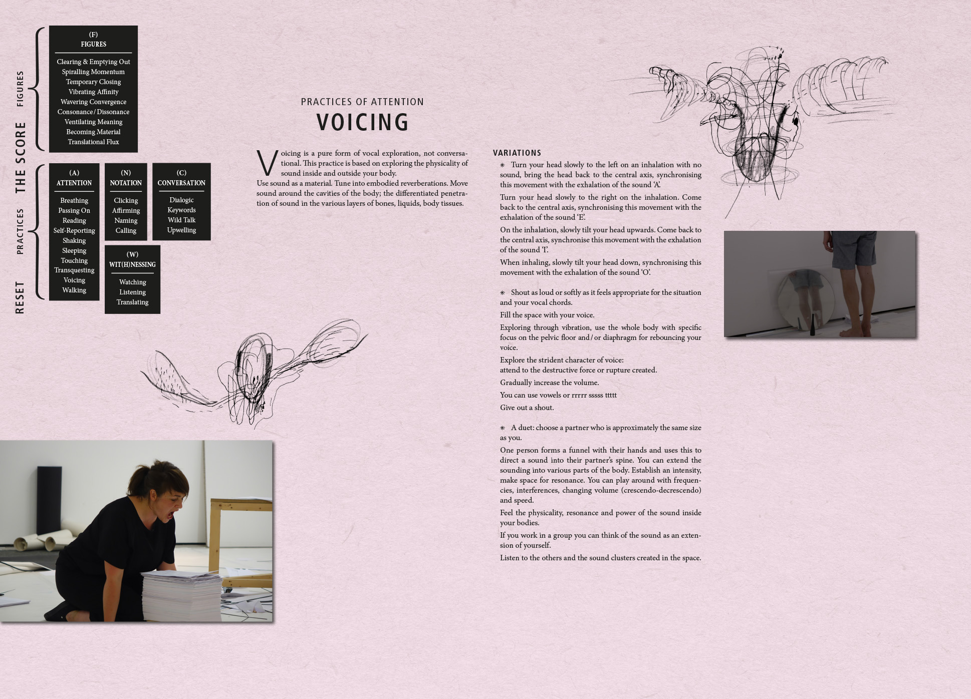 We have developed this exposition for ‘scoring an aesthetic encounter’ with the multimodal (visual, textual, sonic, performative) findings from Choreo-graphic Figures: Deviations from the Line, an artistic research project by Emma Cocker, Nikolaus Gansterer and Mariella Greil. Choreo-graphic Figures stages a beyond-disciplinary encounter between the lines of choreography, drawing and writing, for exploring those forms of knowing-thinking-feeling produced in the slippage and deviation when different modes of practice enter into dialogue, overlap and collide. Within this exposition, our aim is not to present an exhaustive account of the Choreo-graphic Figures project. Rather, we seek to test the specificity of this online context for extending our investigation through the following questions: how can we create a digital archive capable of reflecting the durational and relational aspects of the research process, a mode of online dissemination that enacts something of the liveness or vitality — the energies and intensities — within collaborative live exploration? Beyond the limitations of the static two-dimensional page, how can an enhanced digital format enable a non-linear, rhizomatic encounter with artistic research, where findings are activated and navigated, interacted or even played with as a choreo-graphic event? We have modelled the exposition on the experimental score system developed within our research project, for organising our process of aesthetic enquiry through the bringing-into-relation of different practices and figures. The score is approached as a ‘research tool’ for testing how different practices (of Attention, Notation, Conversation, Wit(h)nessing) can be activated for sharpening, focusing or redirecting attention towards the event of figuring (those small yet transformative energies, emergences, and experiential shifts within artistic process that are often hard to discern but which ultimately steer the evolving action) and the emergence of figures (the point at which the experience of ‘something happening’ [i.e. figuring] coalesces into recognisable form). Within this exposition, our research can be encountered experientially through → Playing the Score, whilst the → Find Out More section contains contextual framing alongside conceptual-theoretical reflections on the function of our score and its ecology of practices and figures.