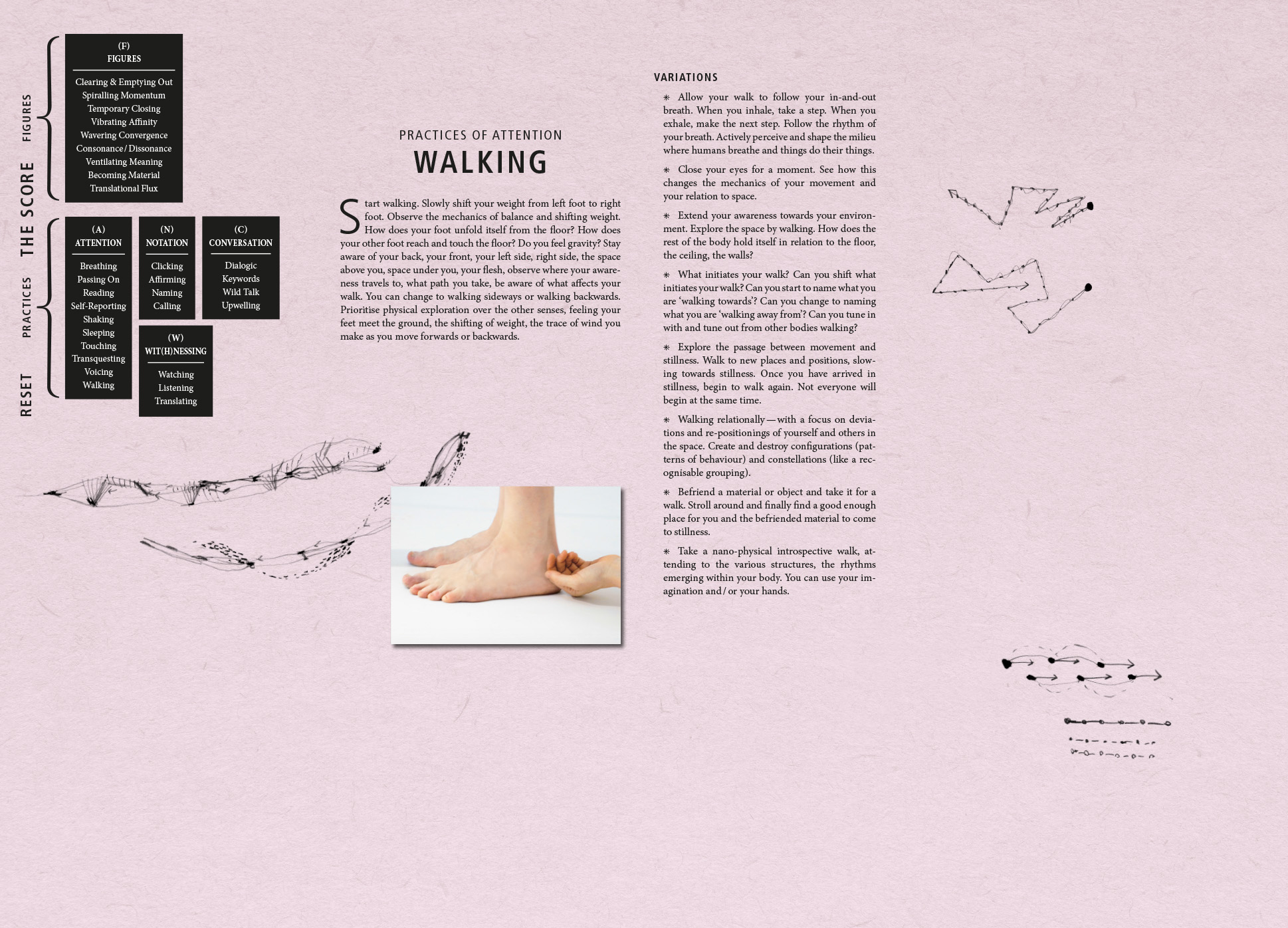 We have developed this exposition for ‘scoring an aesthetic encounter’ with the multimodal (visual, textual, sonic, performative) findings from Choreo-graphic Figures: Deviations from the Line, an artistic research project by Emma Cocker, Nikolaus Gansterer and Mariella Greil. Choreo-graphic Figures stages a beyond-disciplinary encounter between the lines of choreography, drawing and writing, for exploring those forms of knowing-thinking-feeling produced in the slippage and deviation when different modes of practice enter into dialogue, overlap and collide. Within this exposition, our aim is not to present an exhaustive account of the Choreo-graphic Figures project. Rather, we seek to test the specificity of this online context for extending our investigation through the following questions: how can we create a digital archive capable of reflecting the durational and relational aspects of the research process, a mode of online dissemination that enacts something of the liveness or vitality — the energies and intensities — within collaborative live exploration? Beyond the limitations of the static two-dimensional page, how can an enhanced digital format enable a non-linear, rhizomatic encounter with artistic research, where findings are activated and navigated, interacted or even played with as a choreo-graphic event? We have modelled the exposition on the experimental score system developed within our research project, for organising our process of aesthetic enquiry through the bringing-into-relation of different practices and figures. The score is approached as a ‘research tool’ for testing how different practices (of Attention, Notation, Conversation, Wit(h)nessing) can be activated for sharpening, focusing or redirecting attention towards the event of figuring (those small yet transformative energies, emergences, and experiential shifts within artistic process that are often hard to discern but which ultimately steer the evolving action) and the emergence of figures (the point at which the experience of ‘something happening’ [i.e. figuring] coalesces into recognisable form). Within this exposition, our research can be encountered experientially through → Playing the Score, whilst the → Find Out More section contains contextual framing alongside conceptual-theoretical reflections on the function of our score and its ecology of practices and figures.
