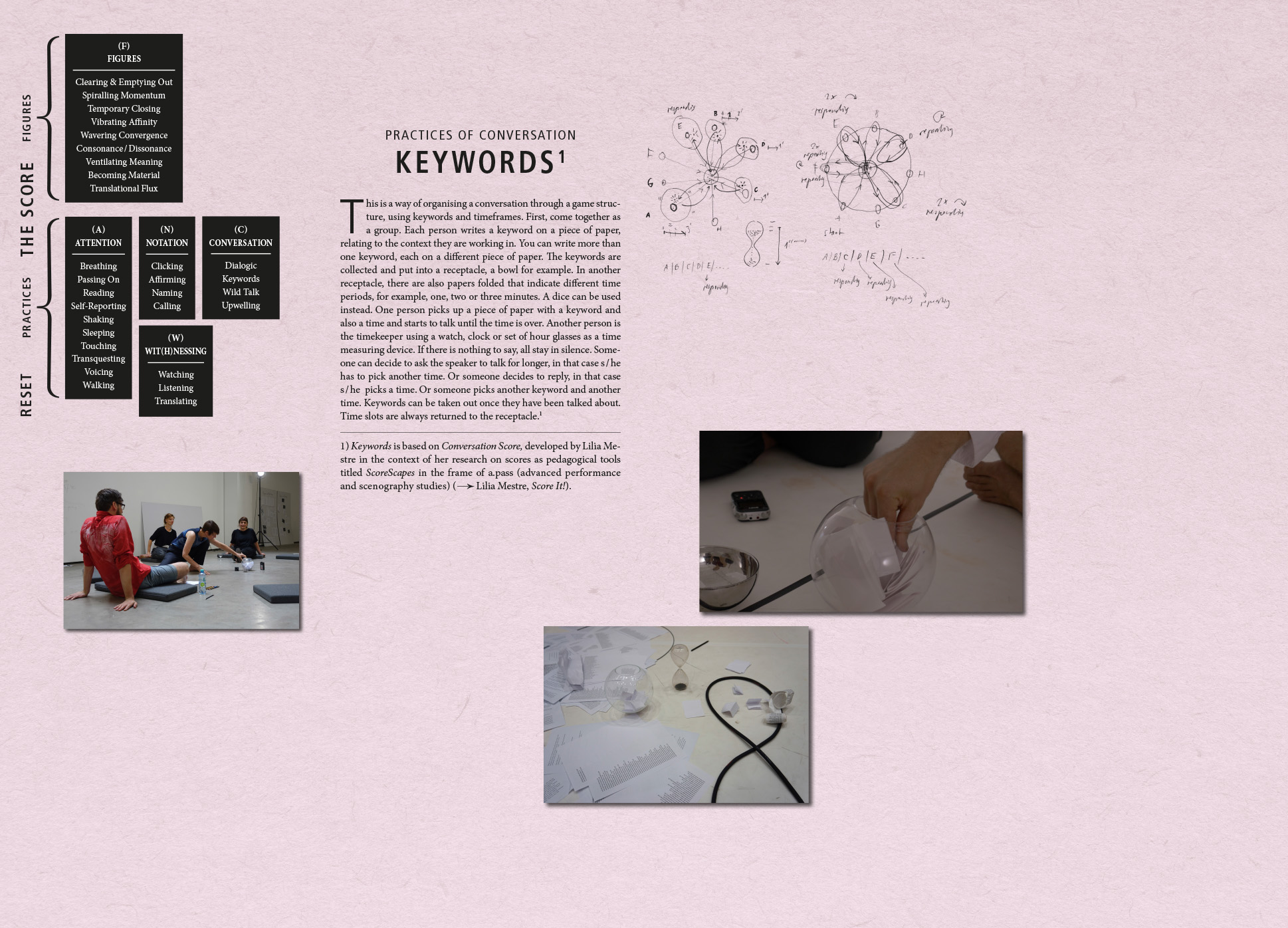 We have developed this exposition for ‘scoring an aesthetic encounter’ with the multimodal (visual, textual, sonic, performative) findings from Choreo-graphic Figures: Deviations from the Line, an artistic research project by Emma Cocker, Nikolaus Gansterer and Mariella Greil. Choreo-graphic Figures stages a beyond-disciplinary encounter between the lines of choreography, drawing and writing, for exploring those forms of knowing-thinking-feeling produced in the slippage and deviation when different modes of practice enter into dialogue, overlap and collide. Within this exposition, our aim is not to present an exhaustive account of the Choreo-graphic Figures project. Rather, we seek to test the specificity of this online context for extending our investigation through the following questions: how can we create a digital archive capable of reflecting the durational and relational aspects of the research process, a mode of online dissemination that enacts something of the liveness or vitality — the energies and intensities — within collaborative live exploration? Beyond the limitations of the static two-dimensional page, how can an enhanced digital format enable a non-linear, rhizomatic encounter with artistic research, where findings are activated and navigated, interacted or even played with as a choreo-graphic event? We have modelled the exposition on the experimental score system developed within our research project, for organising our process of aesthetic enquiry through the bringing-into-relation of different practices and figures. The score is approached as a ‘research tool’ for testing how different practices (of Attention, Notation, Conversation, Wit(h)nessing) can be activated for sharpening, focusing or redirecting attention towards the event of figuring (those small yet transformative energies, emergences, and experiential shifts within artistic process that are often hard to discern but which ultimately steer the evolving action) and the emergence of figures (the point at which the experience of ‘something happening’ [i.e. figuring] coalesces into recognisable form). Within this exposition, our research can be encountered experientially through → Playing the Score, whilst the → Find Out More section contains contextual framing alongside conceptual-theoretical reflections on the function of our score and its ecology of practices and figures.