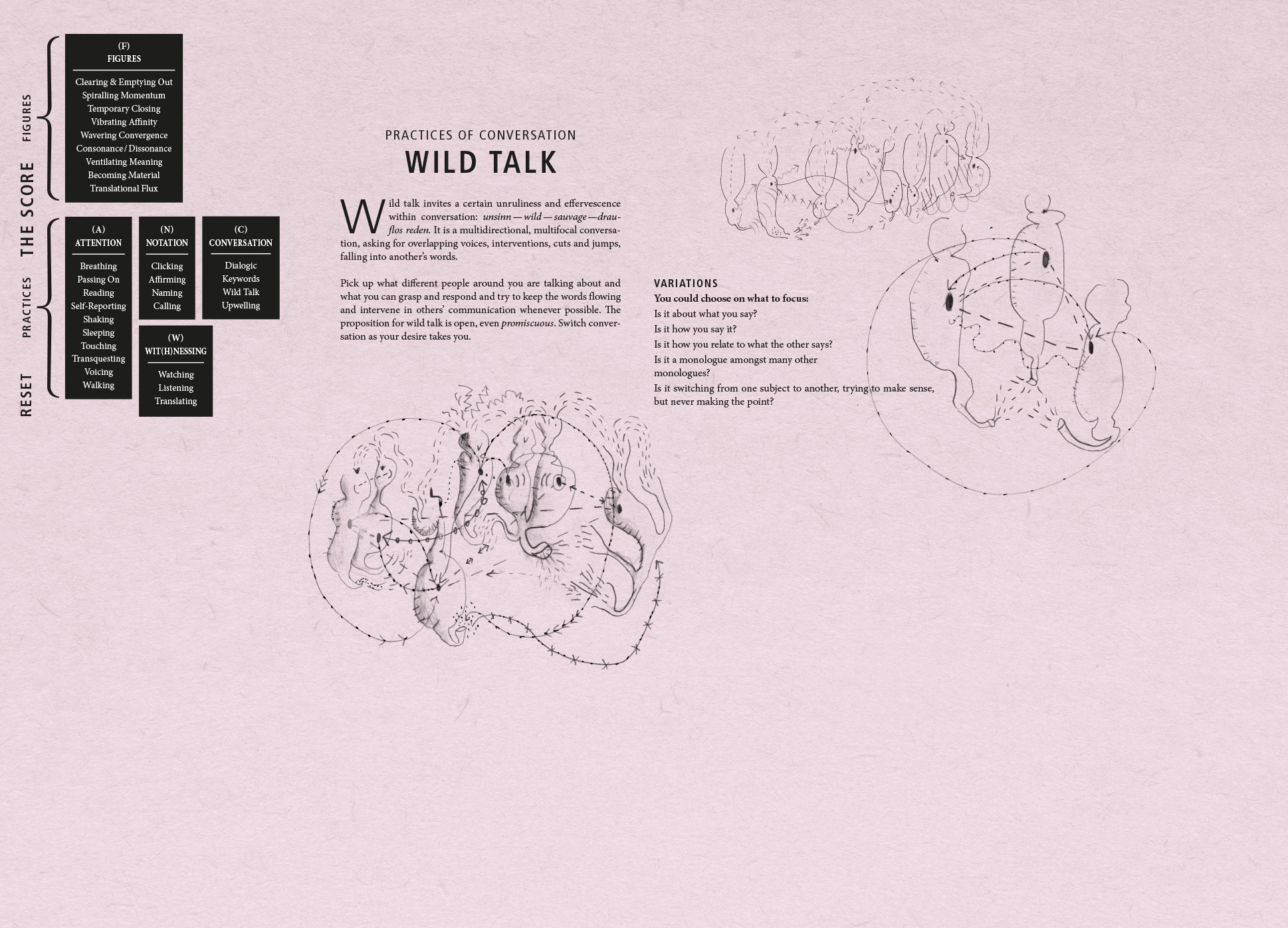 We have developed this exposition for ‘scoring an aesthetic encounter’ with the multimodal (visual, textual, sonic, performative) findings from Choreo-graphic Figures: Deviations from the Line, an artistic research project by Emma Cocker, Nikolaus Gansterer and Mariella Greil. Choreo-graphic Figures stages a beyond-disciplinary encounter between the lines of choreography, drawing and writing, for exploring those forms of knowing-thinking-feeling produced in the slippage and deviation when different modes of practice enter into dialogue, overlap and collide. Within this exposition, our aim is not to present an exhaustive account of the Choreo-graphic Figures project. Rather, we seek to test the specificity of this online context for extending our investigation through the following questions: how can we create a digital archive capable of reflecting the durational and relational aspects of the research process, a mode of online dissemination that enacts something of the liveness or vitality — the energies and intensities — within collaborative live exploration? Beyond the limitations of the static two-dimensional page, how can an enhanced digital format enable a non-linear, rhizomatic encounter with artistic research, where findings are activated and navigated, interacted or even played with as a choreo-graphic event? We have modelled the exposition on the experimental score system developed within our research project, for organising our process of aesthetic enquiry through the bringing-into-relation of different practices and figures. The score is approached as a ‘research tool’ for testing how different practices (of Attention, Notation, Conversation, Wit(h)nessing) can be activated for sharpening, focusing or redirecting attention towards the event of figuring (those small yet transformative energies, emergences, and experiential shifts within artistic process that are often hard to discern but which ultimately steer the evolving action) and the emergence of figures (the point at which the experience of ‘something happening’ [i.e. figuring] coalesces into recognisable form). Within this exposition, our research can be encountered experientially through → Playing the Score, whilst the → Find Out More section contains contextual framing alongside conceptual-theoretical reflections on the function of our score and its ecology of practices and figures.