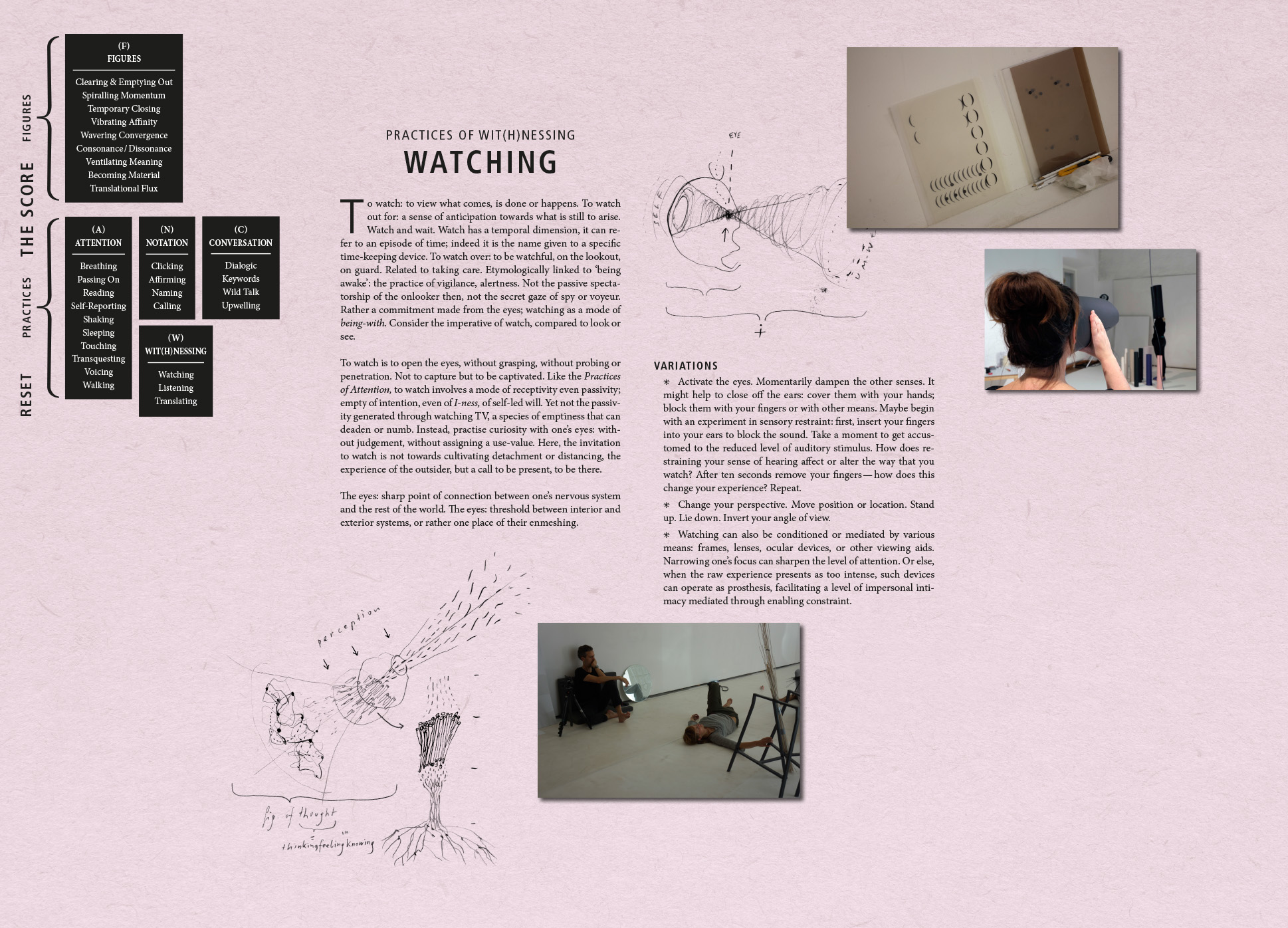 We have developed this exposition for ‘scoring an aesthetic encounter’ with the multimodal (visual, textual, sonic, performative) findings from Choreo-graphic Figures: Deviations from the Line, an artistic research project by Emma Cocker, Nikolaus Gansterer and Mariella Greil. Choreo-graphic Figures stages a beyond-disciplinary encounter between the lines of choreography, drawing and writing, for exploring those forms of knowing-thinking-feeling produced in the slippage and deviation when different modes of practice enter into dialogue, overlap and collide. Within this exposition, our aim is not to present an exhaustive account of the Choreo-graphic Figures project. Rather, we seek to test the specificity of this online context for extending our investigation through the following questions: how can we create a digital archive capable of reflecting the durational and relational aspects of the research process, a mode of online dissemination that enacts something of the liveness or vitality — the energies and intensities — within collaborative live exploration? Beyond the limitations of the static two-dimensional page, how can an enhanced digital format enable a non-linear, rhizomatic encounter with artistic research, where findings are activated and navigated, interacted or even played with as a choreo-graphic event? We have modelled the exposition on the experimental score system developed within our research project, for organising our process of aesthetic enquiry through the bringing-into-relation of different practices and figures. The score is approached as a ‘research tool’ for testing how different practices (of Attention, Notation, Conversation, Wit(h)nessing) can be activated for sharpening, focusing or redirecting attention towards the event of figuring (those small yet transformative energies, emergences, and experiential shifts within artistic process that are often hard to discern but which ultimately steer the evolving action) and the emergence of figures (the point at which the experience of ‘something happening’ [i.e. figuring] coalesces into recognisable form). Within this exposition, our research can be encountered experientially through → Playing the Score, whilst the → Find Out More section contains contextual framing alongside conceptual-theoretical reflections on the function of our score and its ecology of practices and figures.