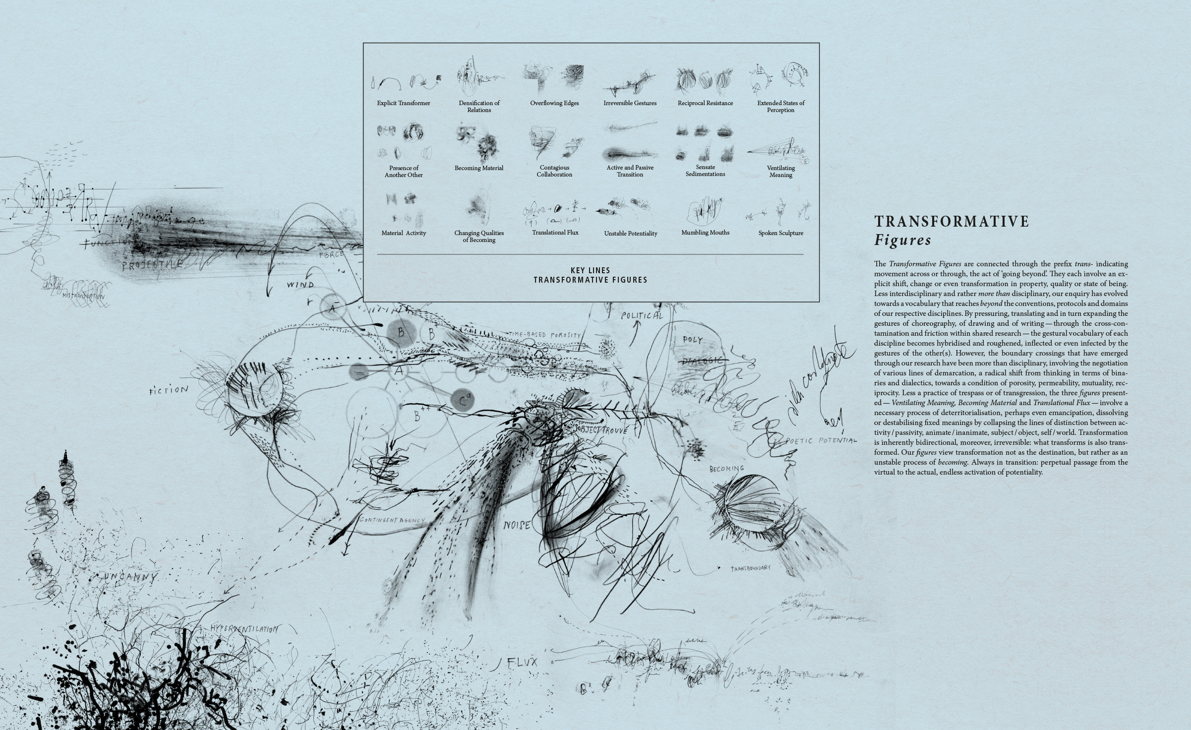 We have developed this exposition for ‘scoring an aesthetic encounter’ with the multimodal (visual, textual, sonic, performative) findings from Choreo-graphic Figures: Deviations from the Line, an artistic research project by Emma Cocker, Nikolaus Gansterer and Mariella Greil. Choreo-graphic Figures stages a beyond-disciplinary encounter between the lines of choreography, drawing and writing, for exploring those forms of knowing-thinking-feeling produced in the slippage and deviation when different modes of practice enter into dialogue, overlap and collide. Within this exposition, our aim is not to present an exhaustive account of the Choreo-graphic Figures project. Rather, we seek to test the specificity of this online context for extending our investigation through the following questions: how can we create a digital archive capable of reflecting the durational and relational aspects of the research process, a mode of online dissemination that enacts something of the liveness or vitality — the energies and intensities — within collaborative live exploration? Beyond the limitations of the static two-dimensional page, how can an enhanced digital format enable a non-linear, rhizomatic encounter with artistic research, where findings are activated and navigated, interacted or even played with as a choreo-graphic event? We have modelled the exposition on the experimental score system developed within our research project, for organising our process of aesthetic enquiry through the bringing-into-relation of different practices and figures. The score is approached as a ‘research tool’ for testing how different practices (of Attention, Notation, Conversation, Wit(h)nessing) can be activated for sharpening, focusing or redirecting attention towards the event of figuring (those small yet transformative energies, emergences, and experiential shifts within artistic process that are often hard to discern but which ultimately steer the evolving action) and the emergence of figures (the point at which the experience of ‘something happening’ [i.e. figuring] coalesces into recognisable form). Within this exposition, our research can be encountered experientially through → Playing the Score, whilst the → Find Out More section contains contextual framing alongside conceptual-theoretical reflections on the function of our score and its ecology of practices and figures.
