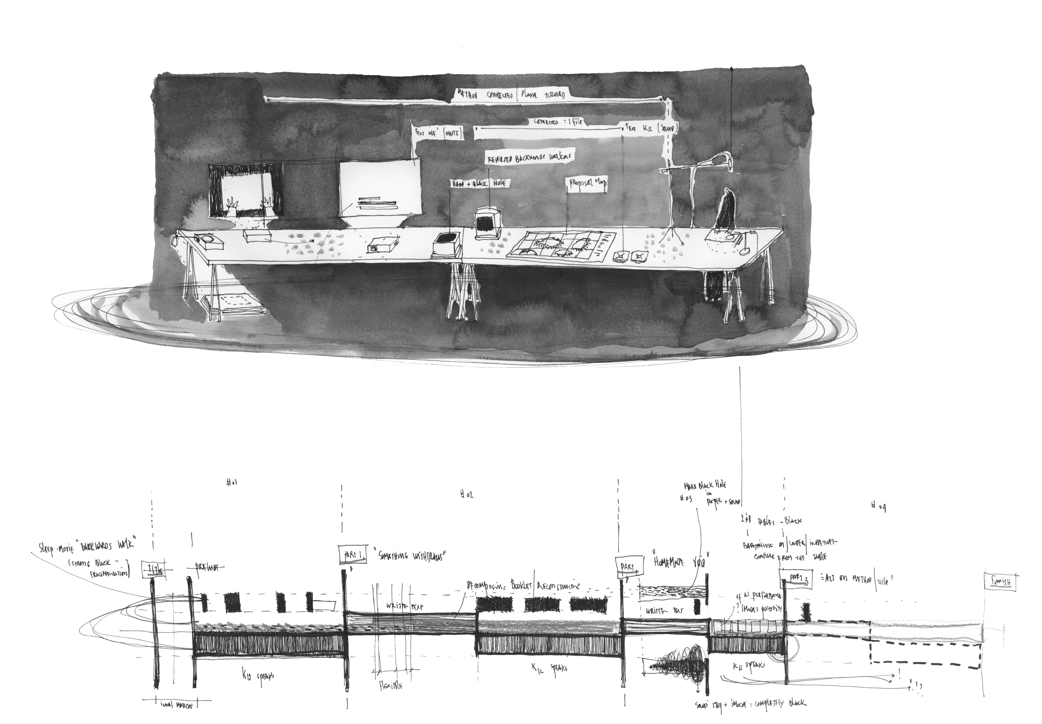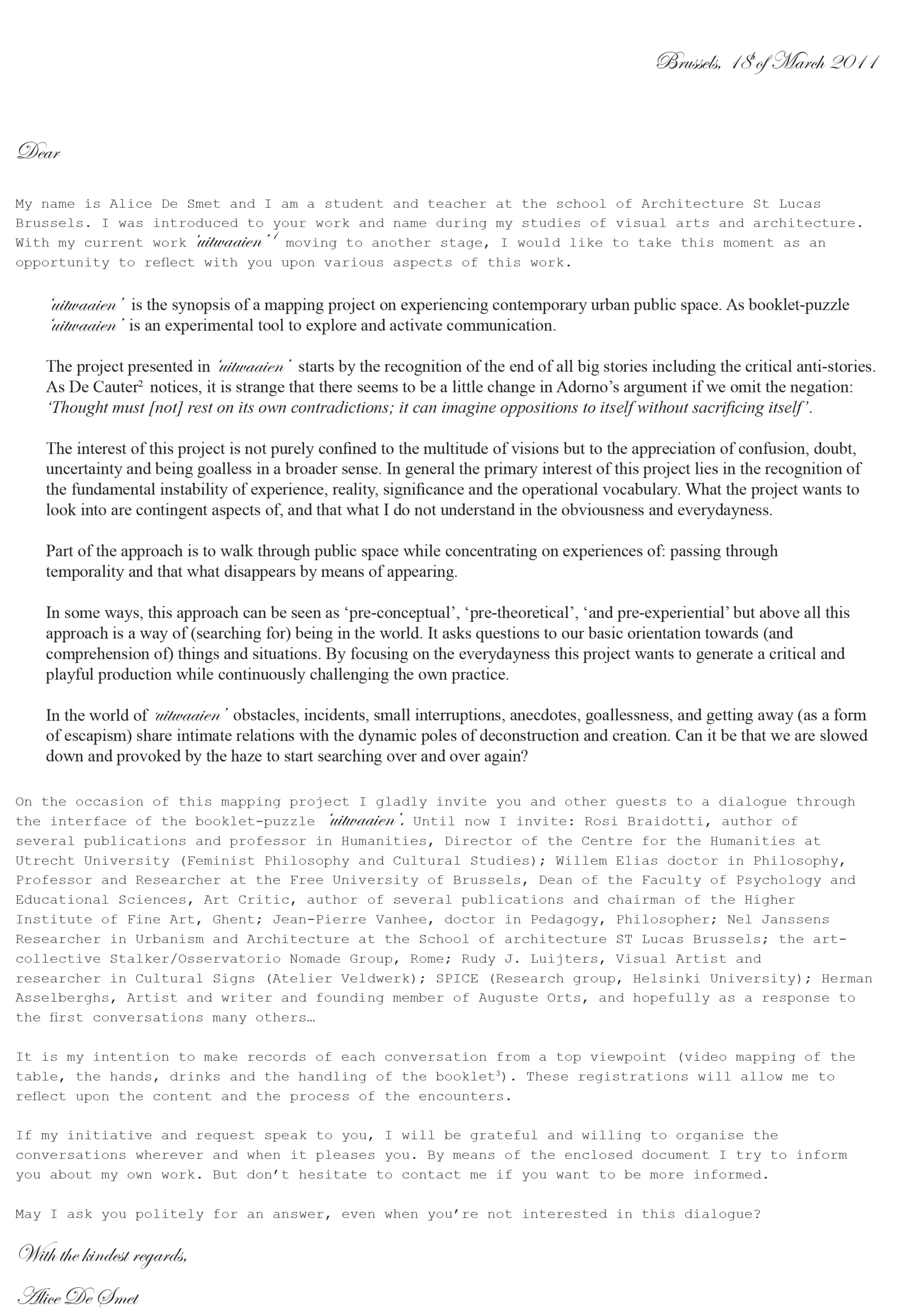 ‘Gatherings’ are the second level of operation of the doctoral study ‘Architecting Bodies by Immersive Gestures’. The first level of operation is called ‘responsive walking’ and is of direct embodied immersion of the author/learner’s bodymind while looking for the mess in urban environments and adopting a micro-perspective by means of walking and embodied creation. The second level departs from the assumption that embodied immersions in mess by responsive walking are desettling and urge sense-making. By creating video-assemblages, performance-lectures and conversation pieces processes of embodied sense-making are explored. Thereby, the challenge is to avoid the pitfalls of quick dichotomic, hierarchic and disembodied understandings of bodymindly engaging with the environment. To resist slipping into these categories – that are so readily present when sense-making is discursively elaborated – the notion of ‘pregnantness’ and the notion of a ‘propelling hypothesis’ are proposed. The former is a bodymind state that allows to imaginatively presence not-yet and becoming significances of embodied engagements with environments. The latter is an operative design instrument that allows the responsive shifts in hypothesis to become the very mechanism of a form-giving practice that reflects whimsicalities and contingencies. In order to work towards ‘pregnantness’ and follow the ‘propelling hypothesis’, gatherings interweave autobiographical, fictional and referential voices (i.e. the work of others) through one another. Also different media (i.e. body, drawing, writing, photo, video, sound, animation, modelling), low-tech assembling and analogue-poetic thinking are put into action to bring more sensory, ephemeral, affective and imaginative aspects of bodymindly relating to the environment into account.
