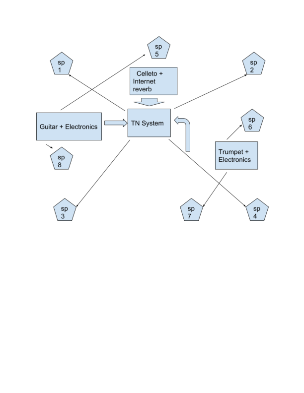 The plan will be to use a 4 channel sound system: a traditional "quad. where the telematic signals coming from Philadelphia (sax) will be used as the main activator for the live electronics, mapping a series of pitch and transient analysis to control the onsets and pitch center tones of the system.