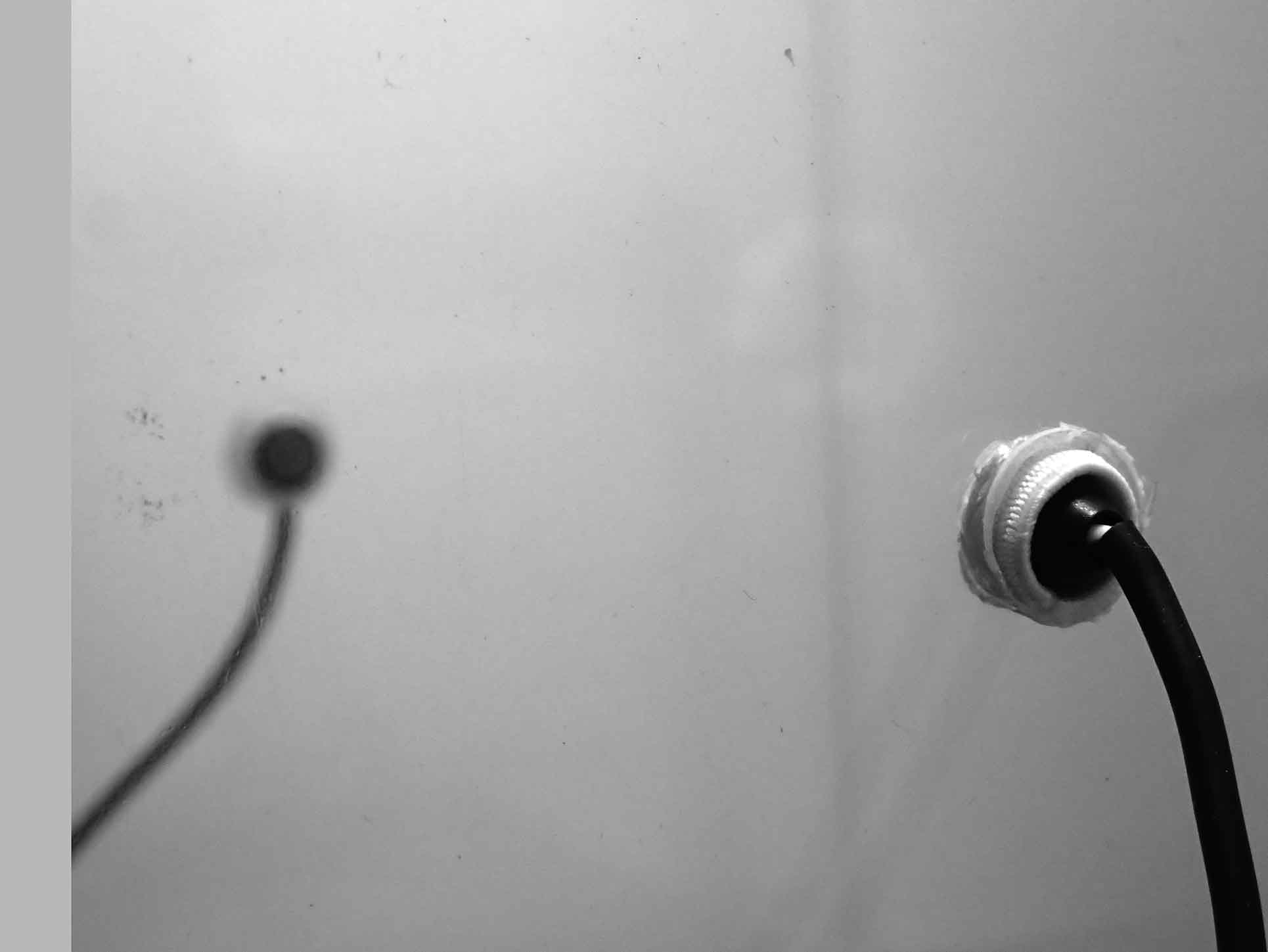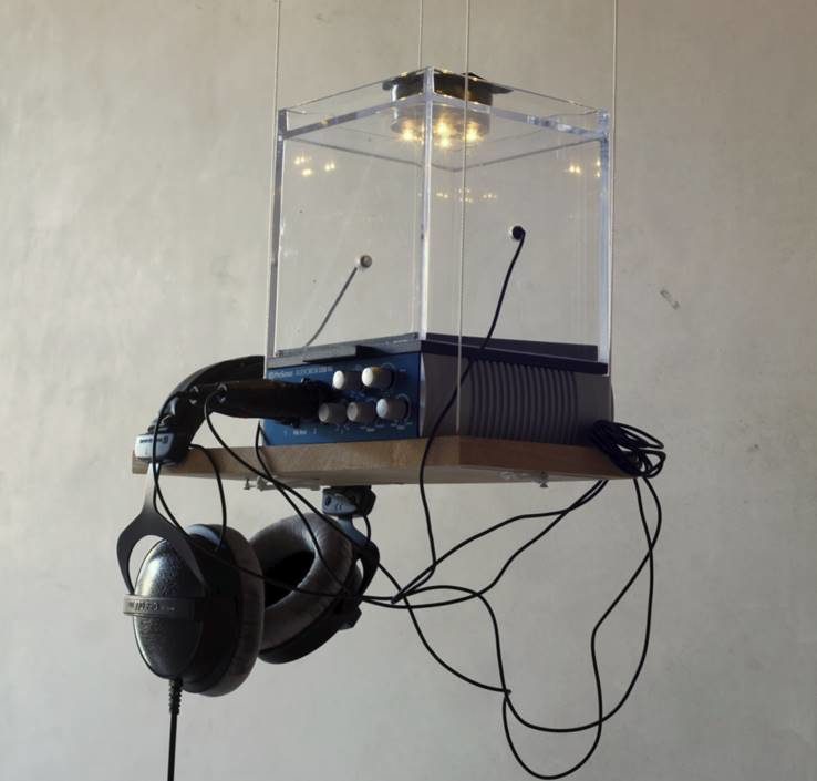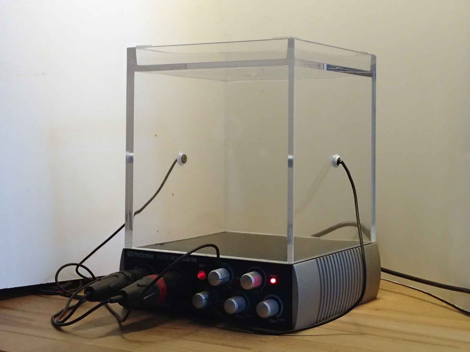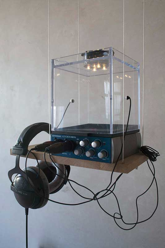 The installation is based on reversed binaural audio effect. Audio recordings of flying insects are collected using a pair of stereo microphones faced against each other and placed on opposite sides of the Karaoke Booth (14x14x14 cm).