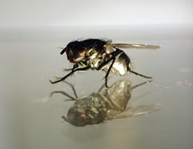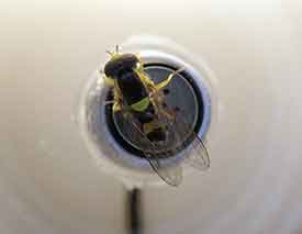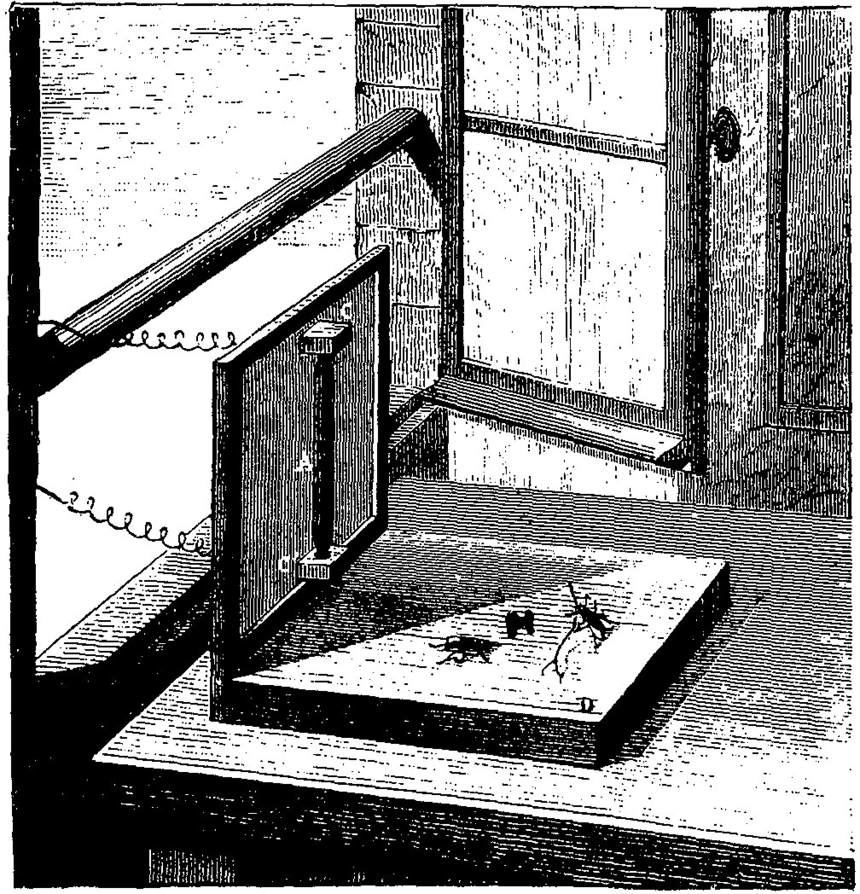 Hughes microphone with recorded fly. The same fly whose footstep was amplified by Hughes's carbon microphone in 1878 to make it audible circles between the left and right channels in Pink Floyd's "Ummagumma."