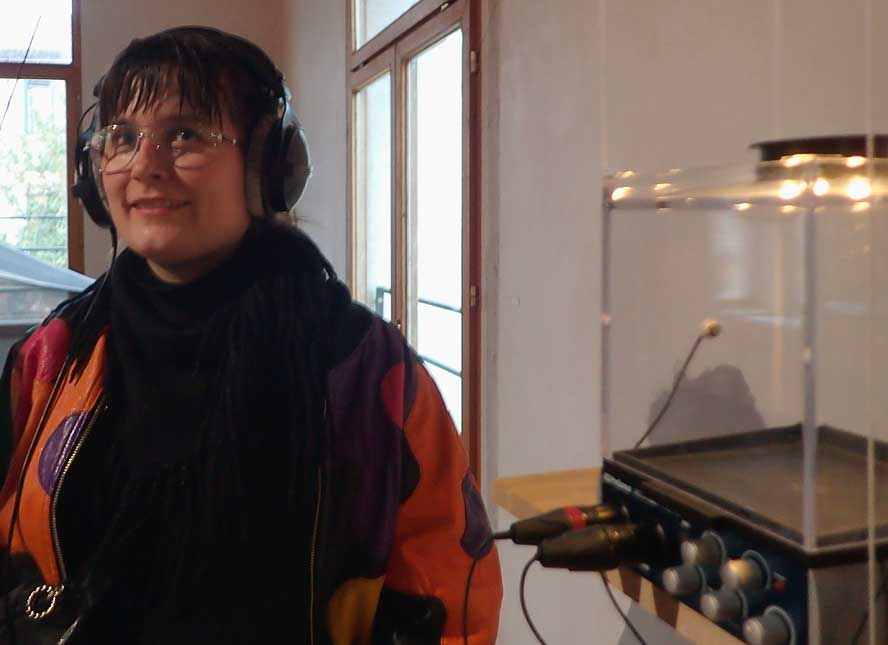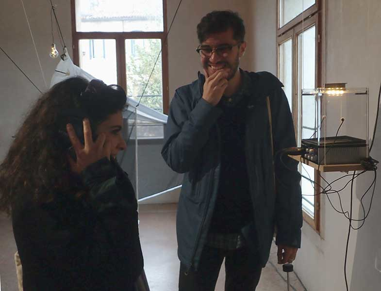 The night after the opening party, Tytti (with the headphones, image on the right) and I launched a performative Insect Karaoke Happening at the Research Pavilion venue. The Wing Beats soundtrack was played back through loudspeakers, and the audience was given simple DIY instruments (thin wine glasses and contact microphones) to join in making music with the electronic insect band. The glasses were played manually by rubbing glass rims with fingers whereas the contact mics were connected to Tytti’s soundcard which manipulated the noises with added effects such as echoes or delays.