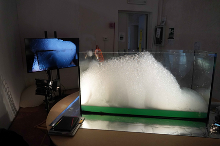 A performative installation by Maiju Loukola and Paul Cegys, using the term foam as both noun and verb (foaming) in order to explore foam-like spatial formations at the intersection of physical, imaginary and virtual space, as well as in terms of space as socio-political construct.