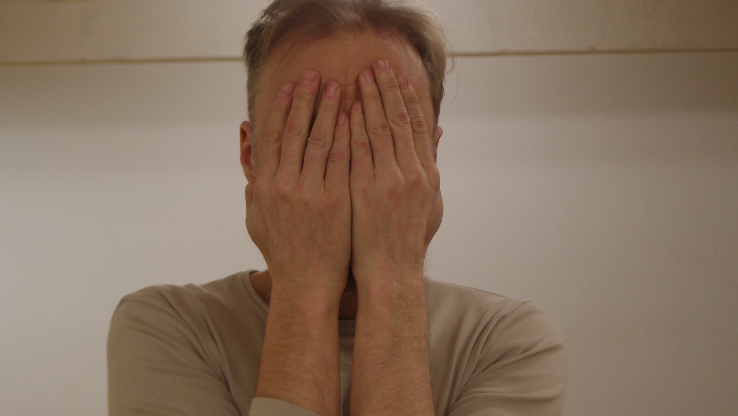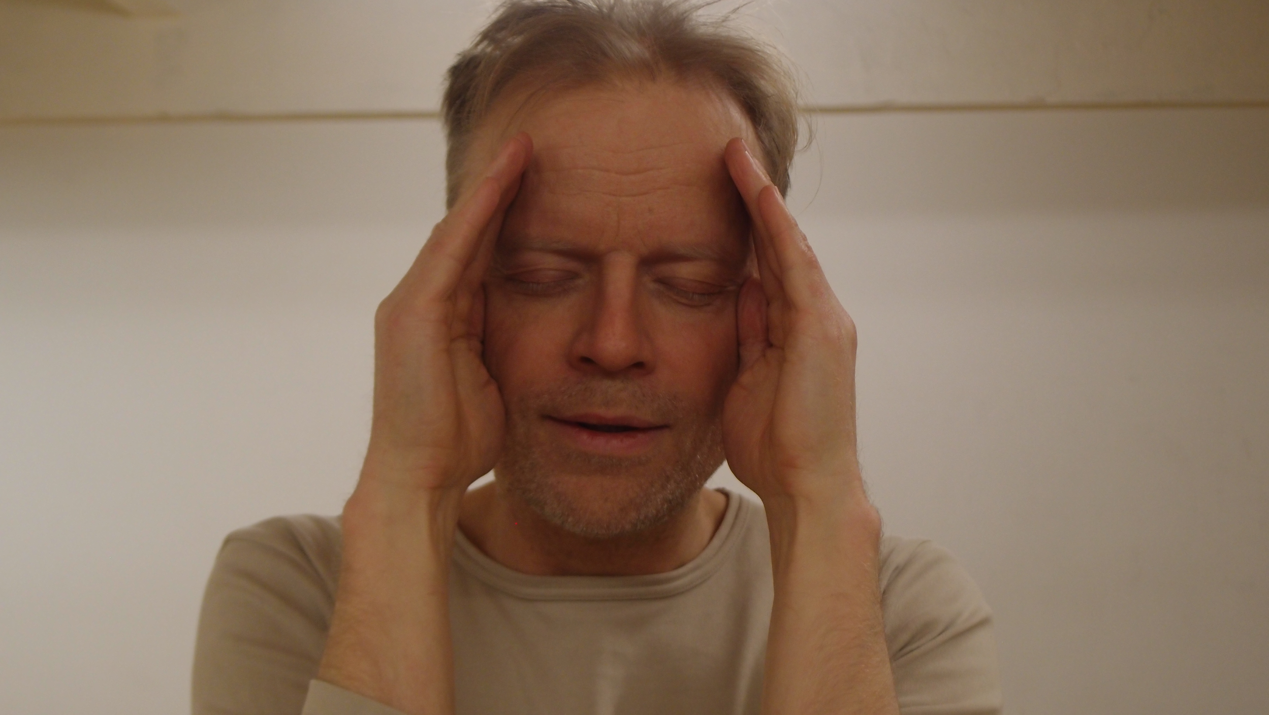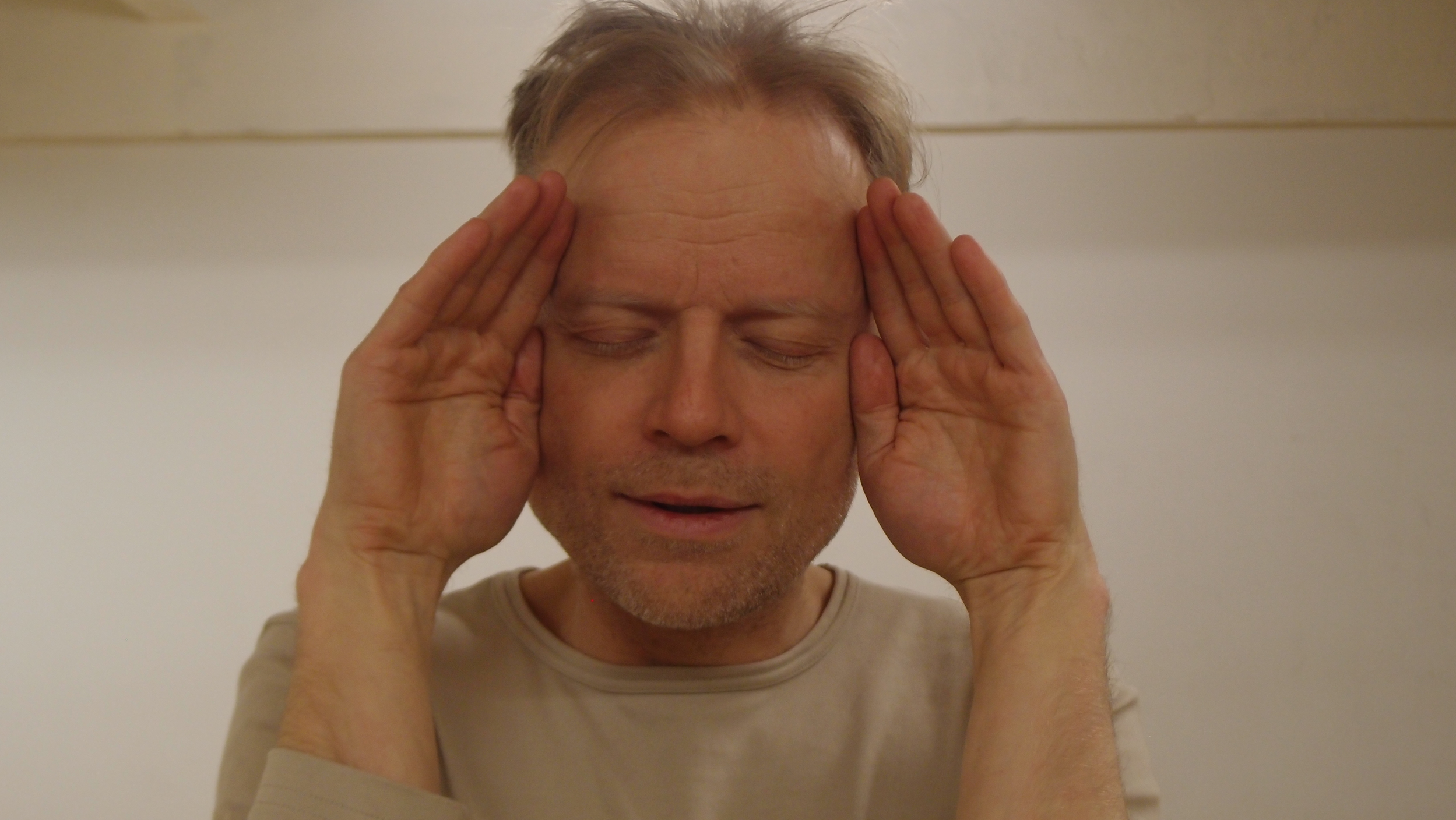 Levolliset kasvot peitetään kaksin käsin omilla kämmenillä. Kämmenet peittävät kasvot aina leukakuopasta otsaan asti: suun, nenän, poskipäät, silmät, kulmakarvat ja suuren osan otsaa. Kämmenet ovat pystysuunnassa, sormet tiiviisti kiinni toisissaan, kämmensyrjät keskellä kasvoja tiiviisti kiinni toisissaan. Luomet pysyvät suljettuina ja kasvot yhä levollisina kämmenten takana.