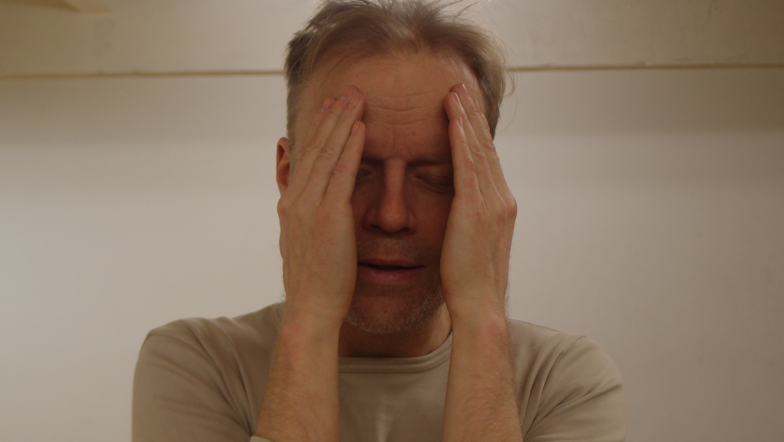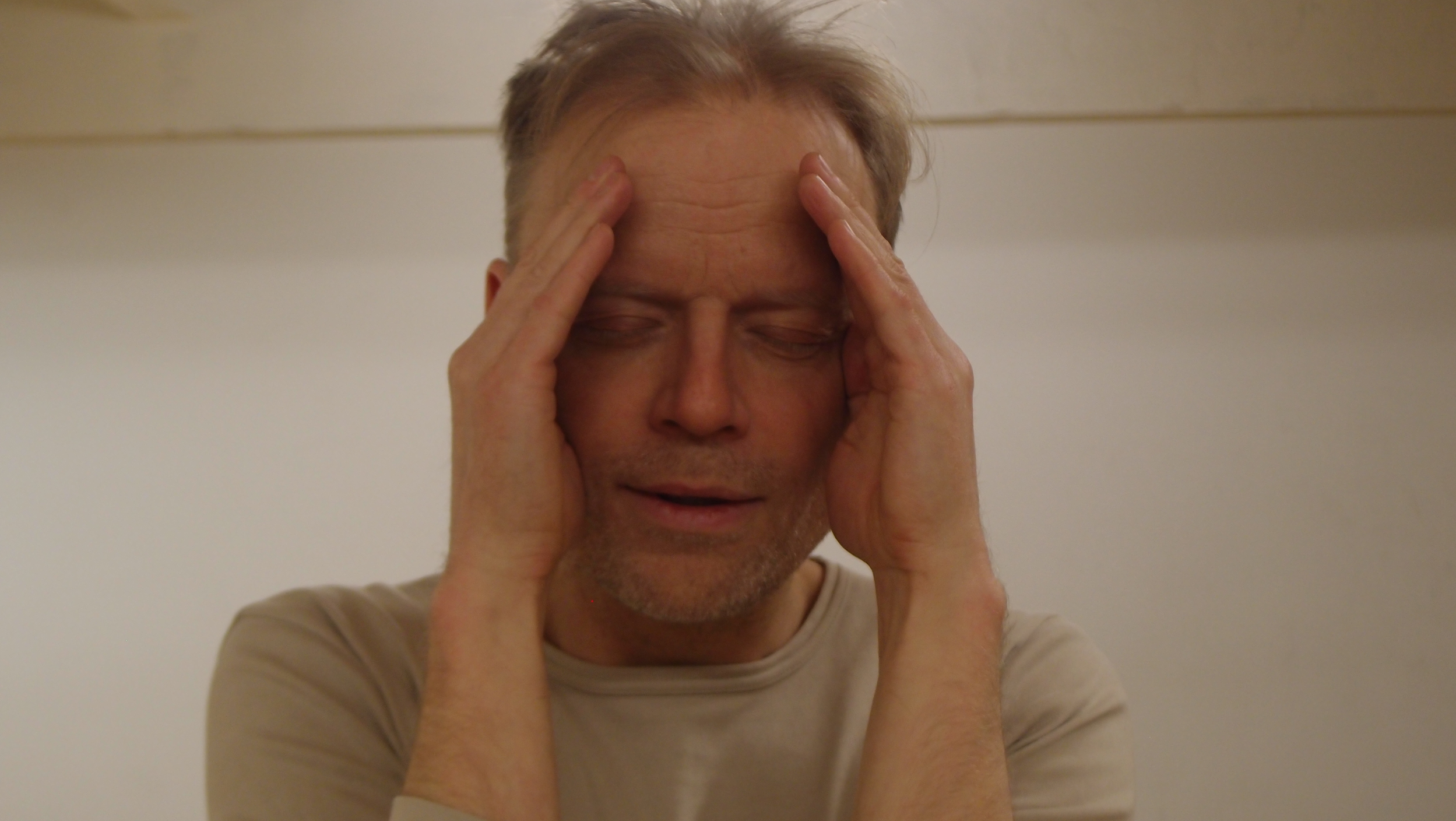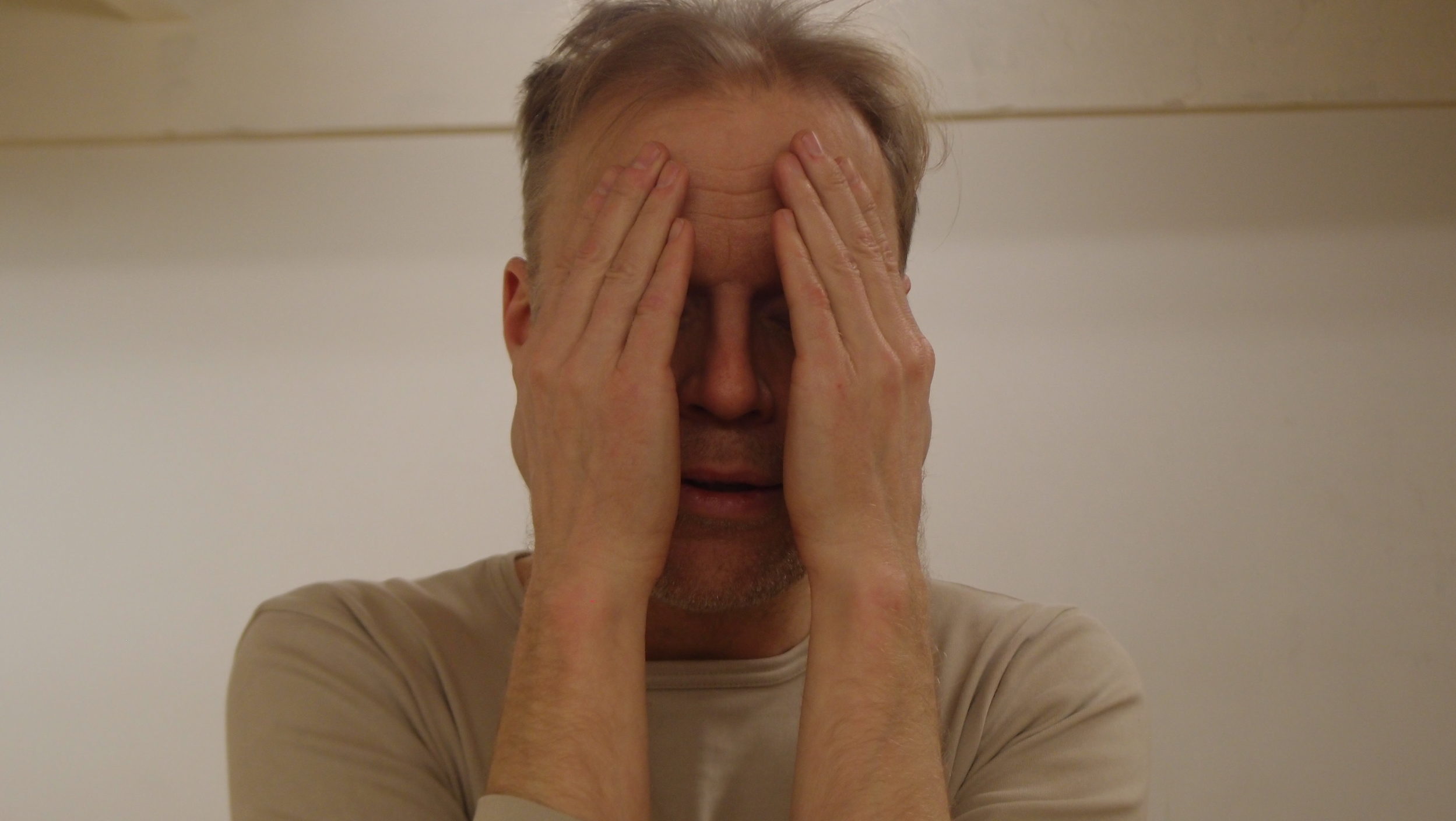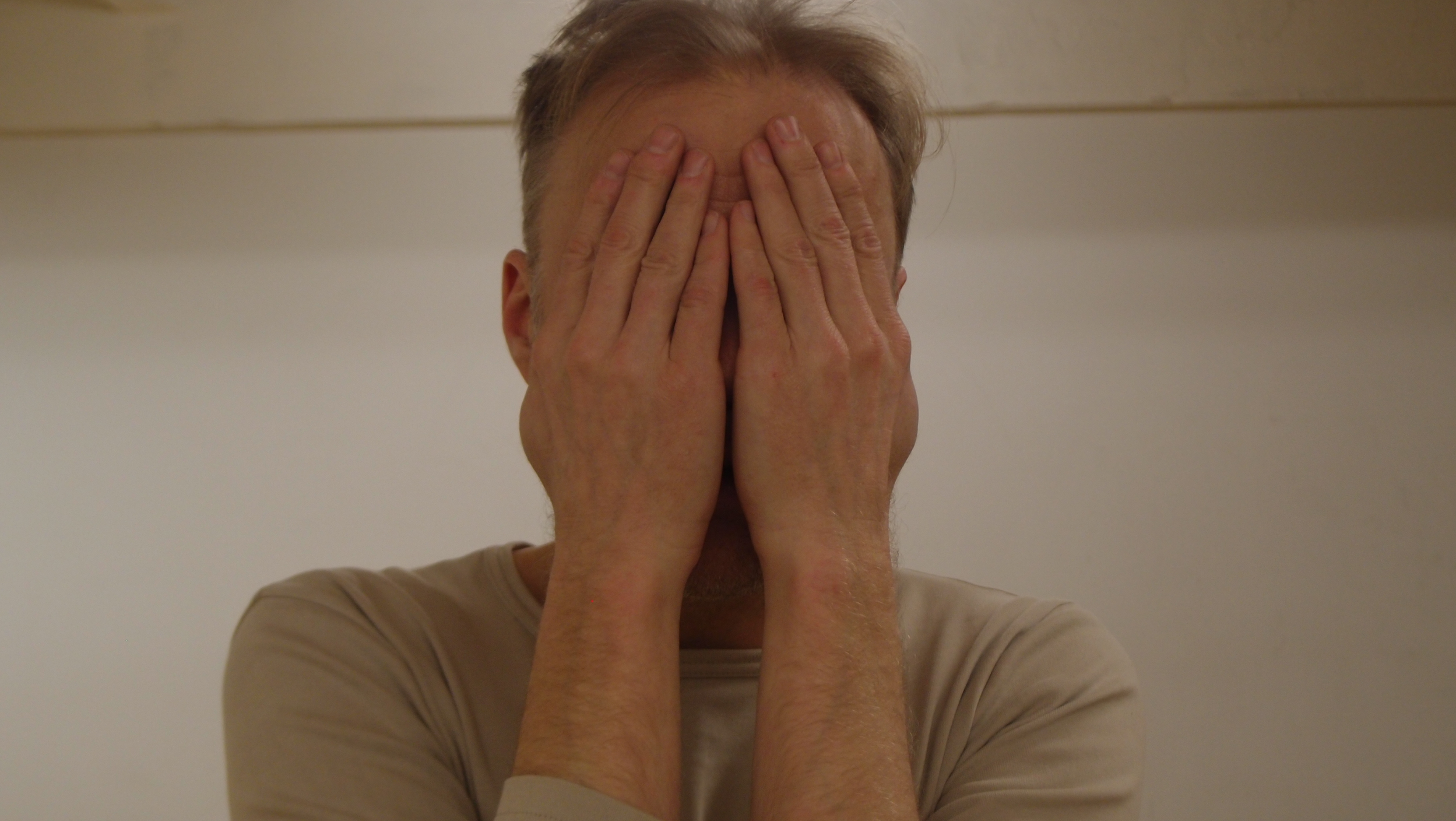 Levolliset kasvot peitetään kaksin käsin omilla kämmenillä. Kämmenet peittävät kasvot aina leukakuopasta otsaan asti: suun, nenän, poskipäät, silmät, kulmakarvat ja suuren osan otsaa. Kämmenet ovat pystysuunnassa, sormet tiiviisti kiinni toisissaan, kämmensyrjät keskellä kasvoja tiiviisti kiinni toisissaan. Luomet pysyvät suljettuina ja kasvot yhä levollisina kämmenten takana.