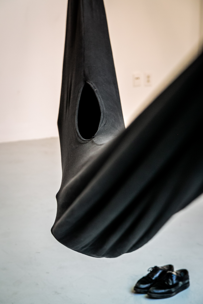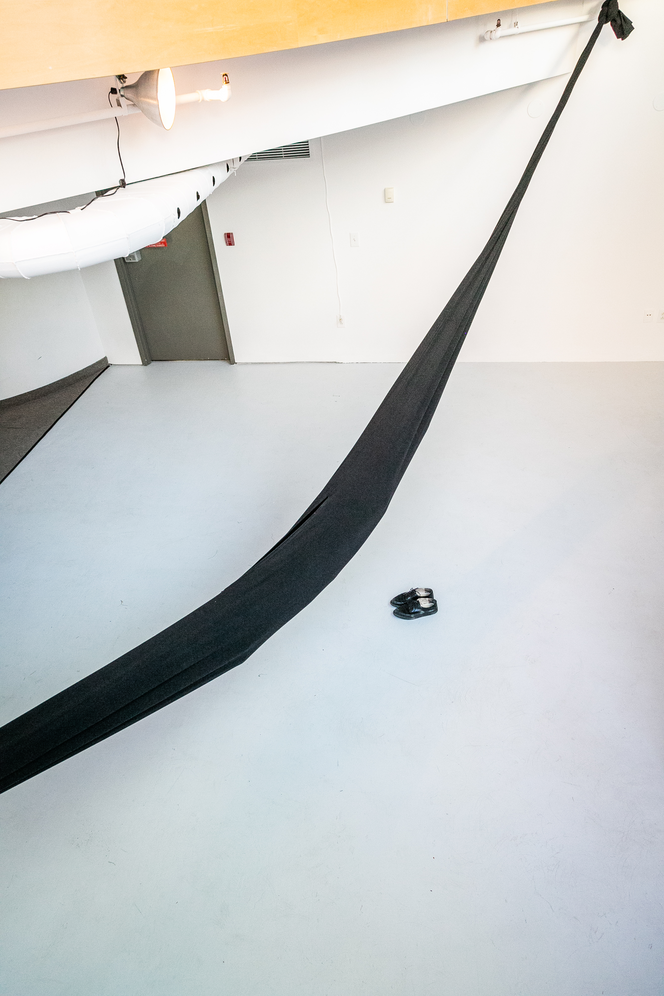 Le projet m’apparait difficile à faire vivre au sein du contexte d’exposition. C’est-à-dire que sa fonction s’adapte aux différents besoins de l’espace et du corps. Parfois rangée, pliée, tendue ou habitée, cette sculpture prend peut-être réellement sens dans un espace domestique où elle s’en trouve toujours permutée. L’espace d’exposition exige une performance pour en illustrer les fonctions, tandis que l’espace de vie répond plus naturellement à la performativité de l’objet. On peut y dormir, y jouer, y lire, se balancer : la sculpture invite à investir son espace interne d’activités du quotidien.