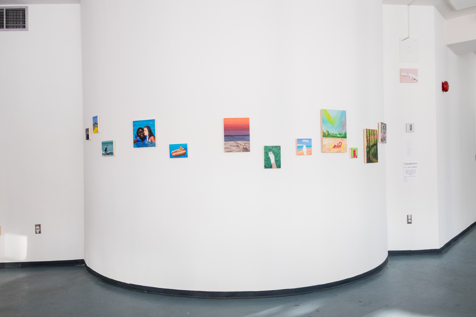Pour le présent cours, j'avais comme but initial de faire le plus de tableaux possible afin d'expérimenter et de tester ce qui fonctionne le mieux en lien avec mon sujet de recherche. J'ai été inspirée par le collectif Team Macho pour leurs peintures petit format à la fois ludique et coloré1 ainsi que leur méthode d'accrochage en mosaïque.2 Je me suis ensuite intéressé à l'historique du lieu et à l'agence de voyages Voyages Campus qu'il y avait dans ce local autour de 2014. J'ai par après orienté mes recherches en cherchant des photos de vacances sur internet. Je cherchais, à l'aide de mots-clés hétéroclites orientés vers le voyage, la plage, les vacances, les images qui détonnaient des typiques photos banales de voyage. Ensuite, soit en reproduisant tel quel l'image trouvé, soit en réalisant un collage de 2 images et vers la fin, en peignant sans images sources, j'ai réalisé 13 tableaux sur ce thème. J'ai choisis ce qui était peint en me basant sur deux aspects ; l'image ni réelle, ni fictive, mais plutôt entre les deux et sur une image qui pourra faire sourire ou rire par son côté ludique et insolite.
