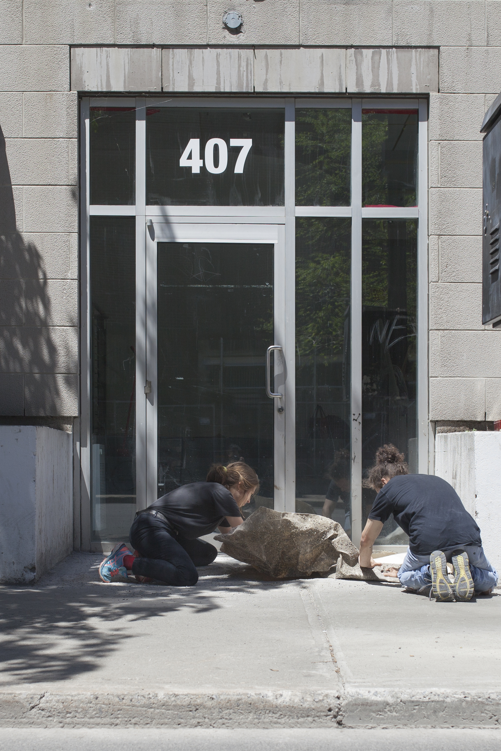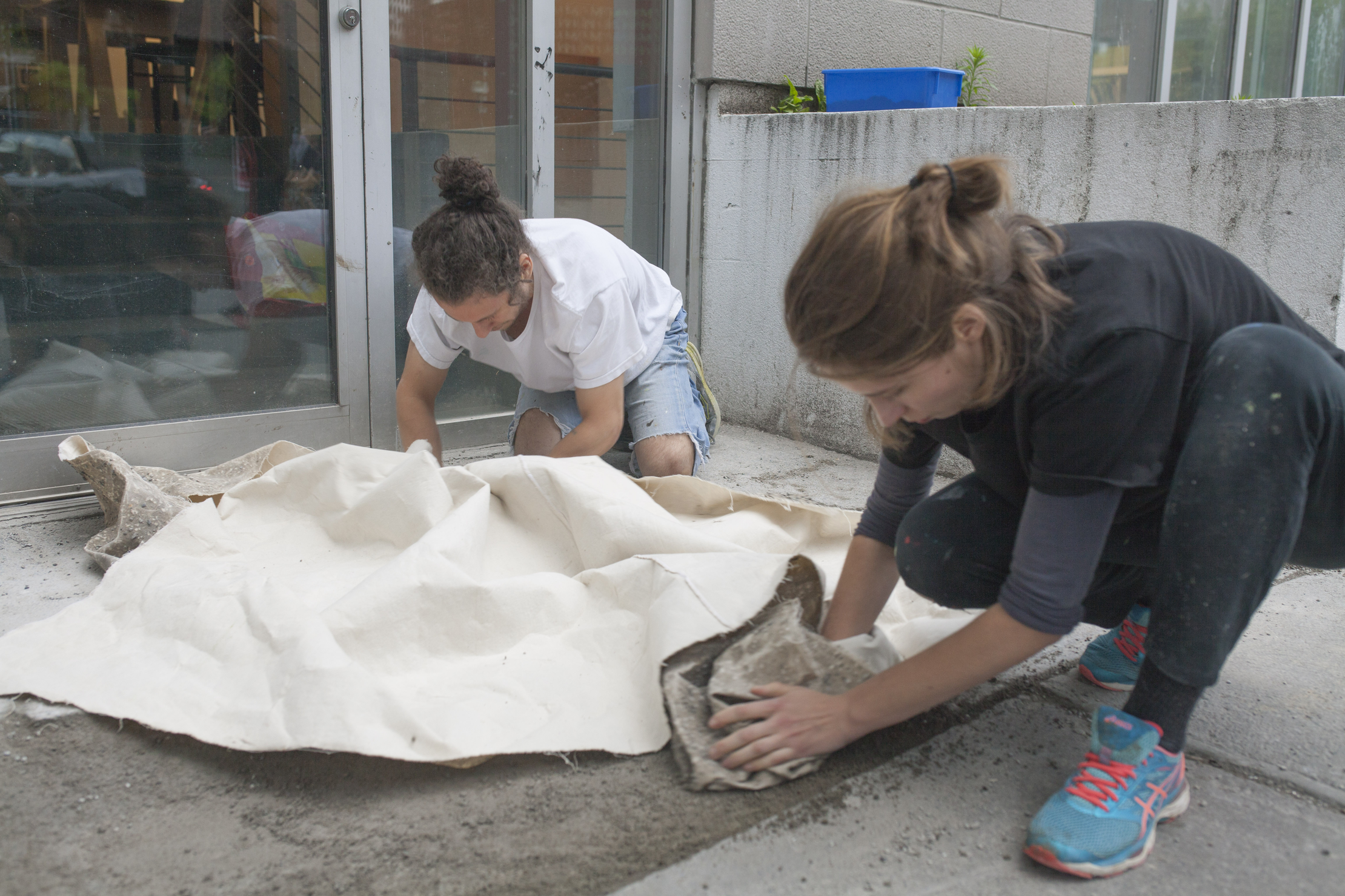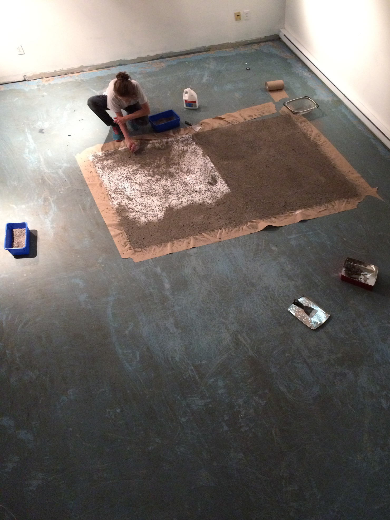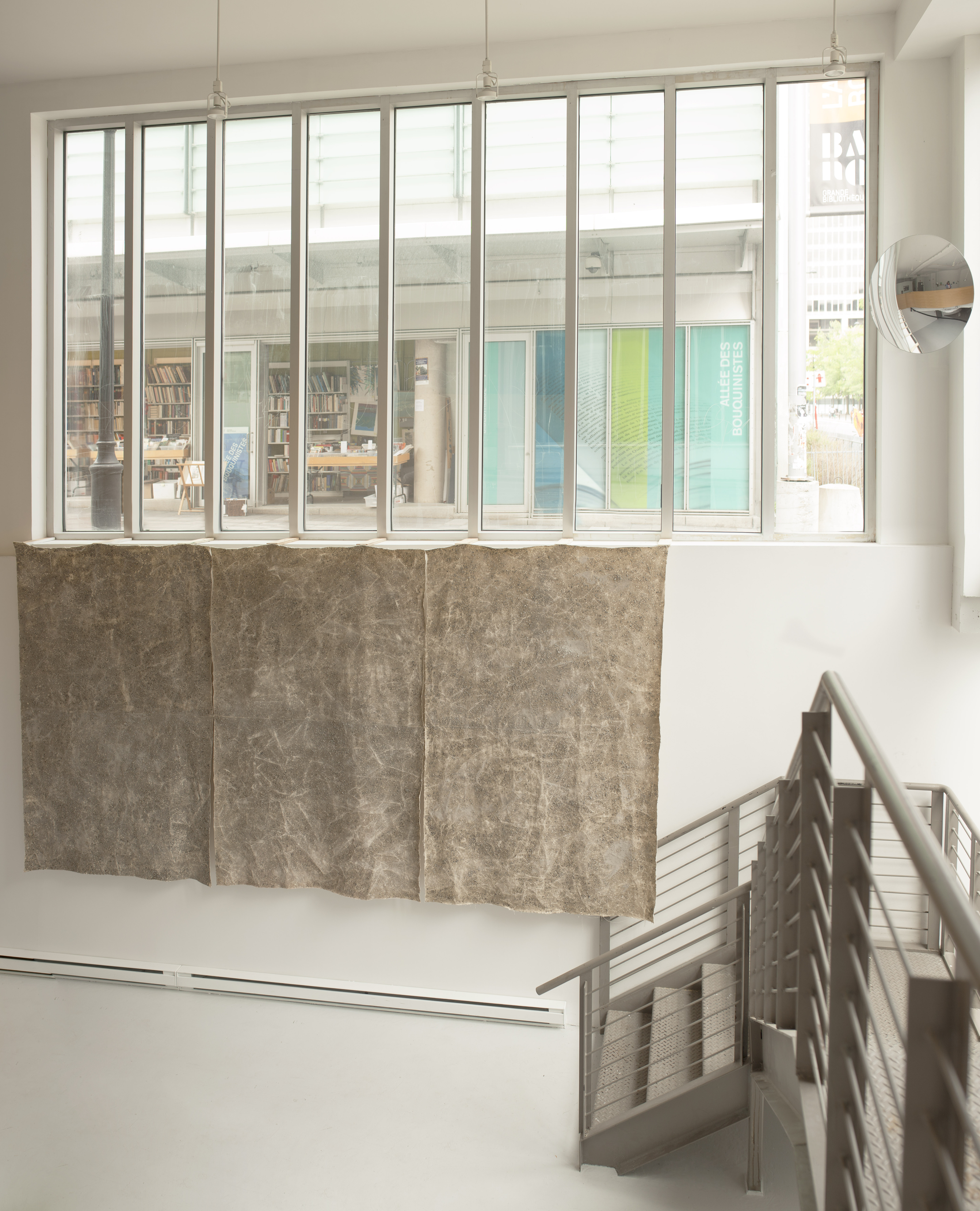 Sans même que personne remarque sa présence, une partie de la fondation s’use. La dalle d’entrée sur laquelle nous marchons pour accéder au 407 de Maisonneuve E se consume au rythme du temps et selon nos passages. Pendant que sa détérioration suit son cours, chaque jour, nous balayons la surface de la dalle. Ainsi amassons-nous, sous forme de granulats et de sable, des quantités importantes de résidus de béton. D’autres matériaux se retrouvent de manière plus éparse parmi notre collecte tels des bouts de bois, de verre, de plastique et de cigarettes. Tout est trié, car trois papiers sablés sont confectionnés à partir des détritus provenant de la dalle mère. Les trois supports mesurent chacun 5 x 8 pieds, soit les dimensions de la dalle. Ils sont taillés dans de la toile de peintre, un produit trouvé en quincaillerie cousu en son milieu suggérant à la fois canevas et matériau de construction.