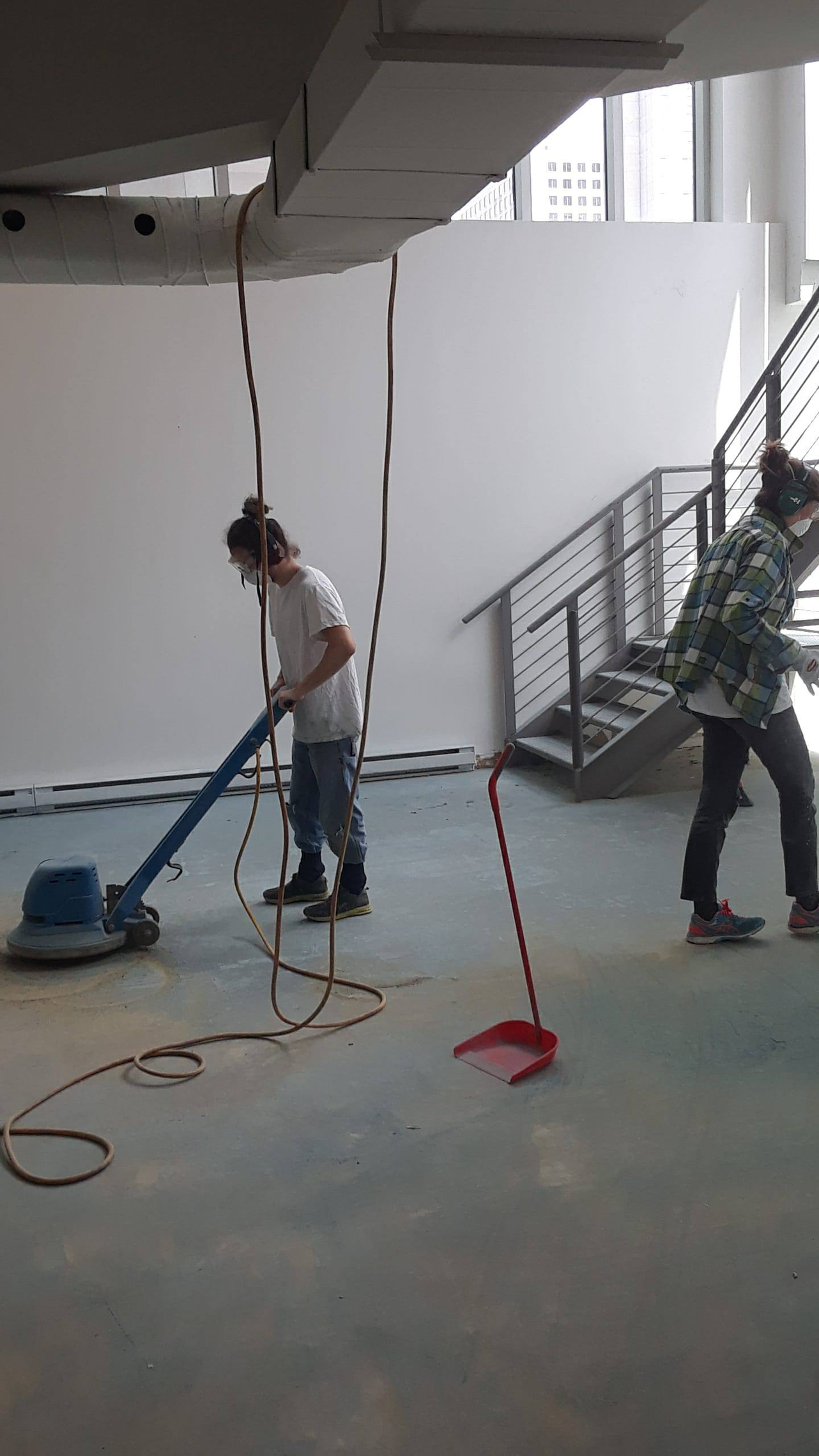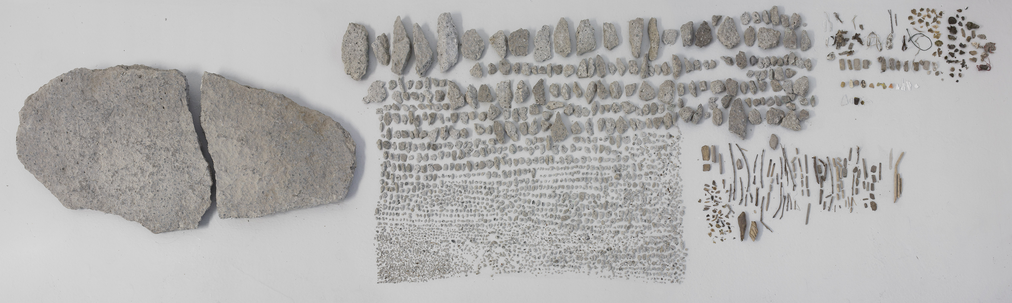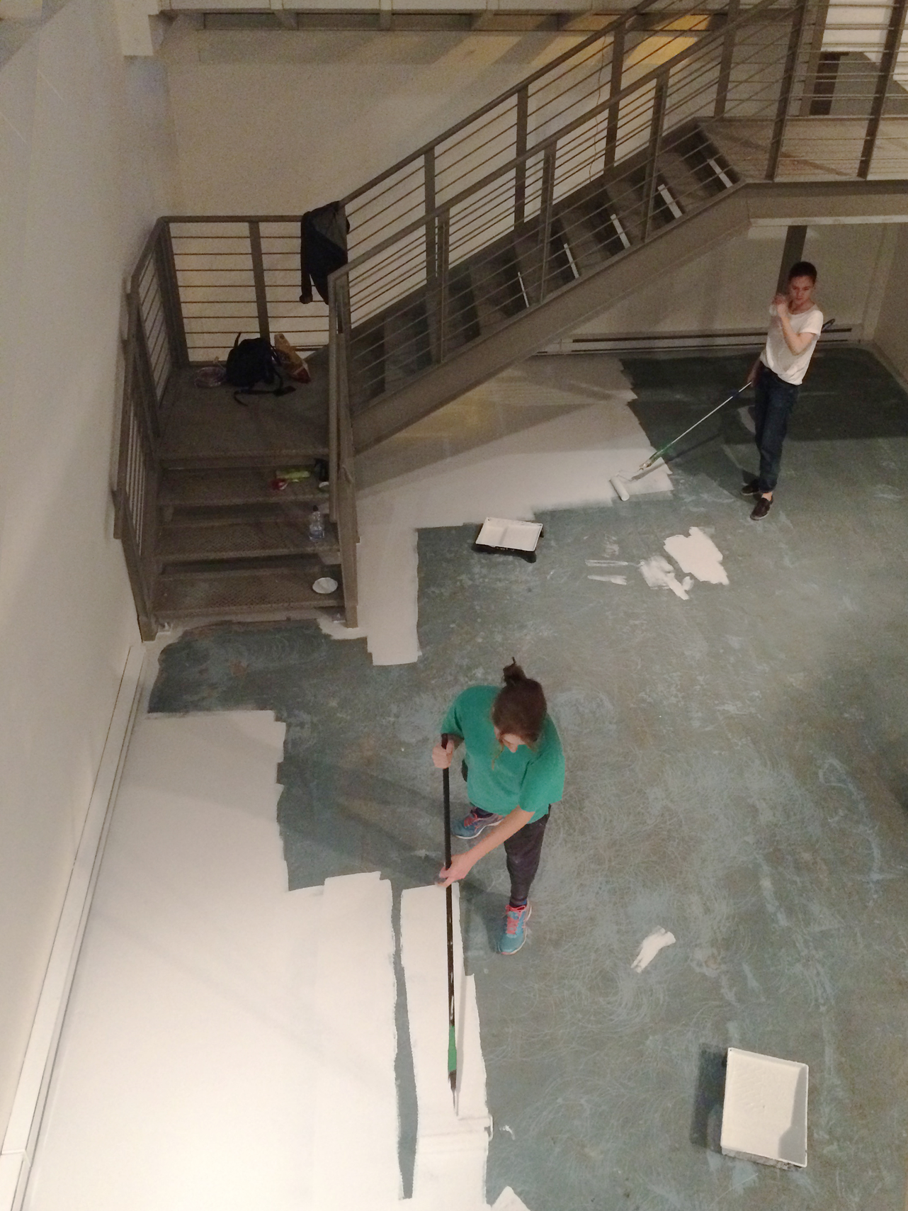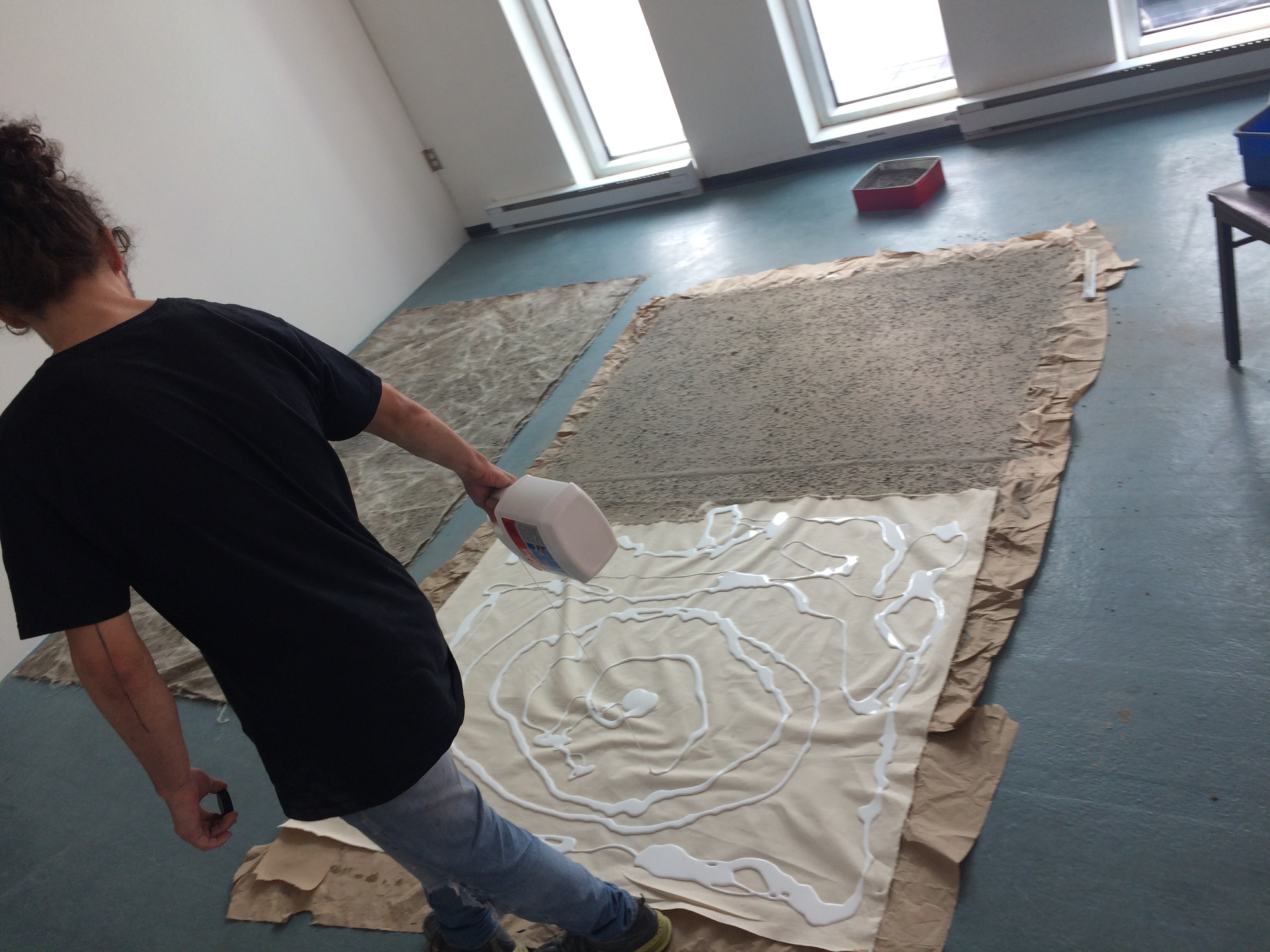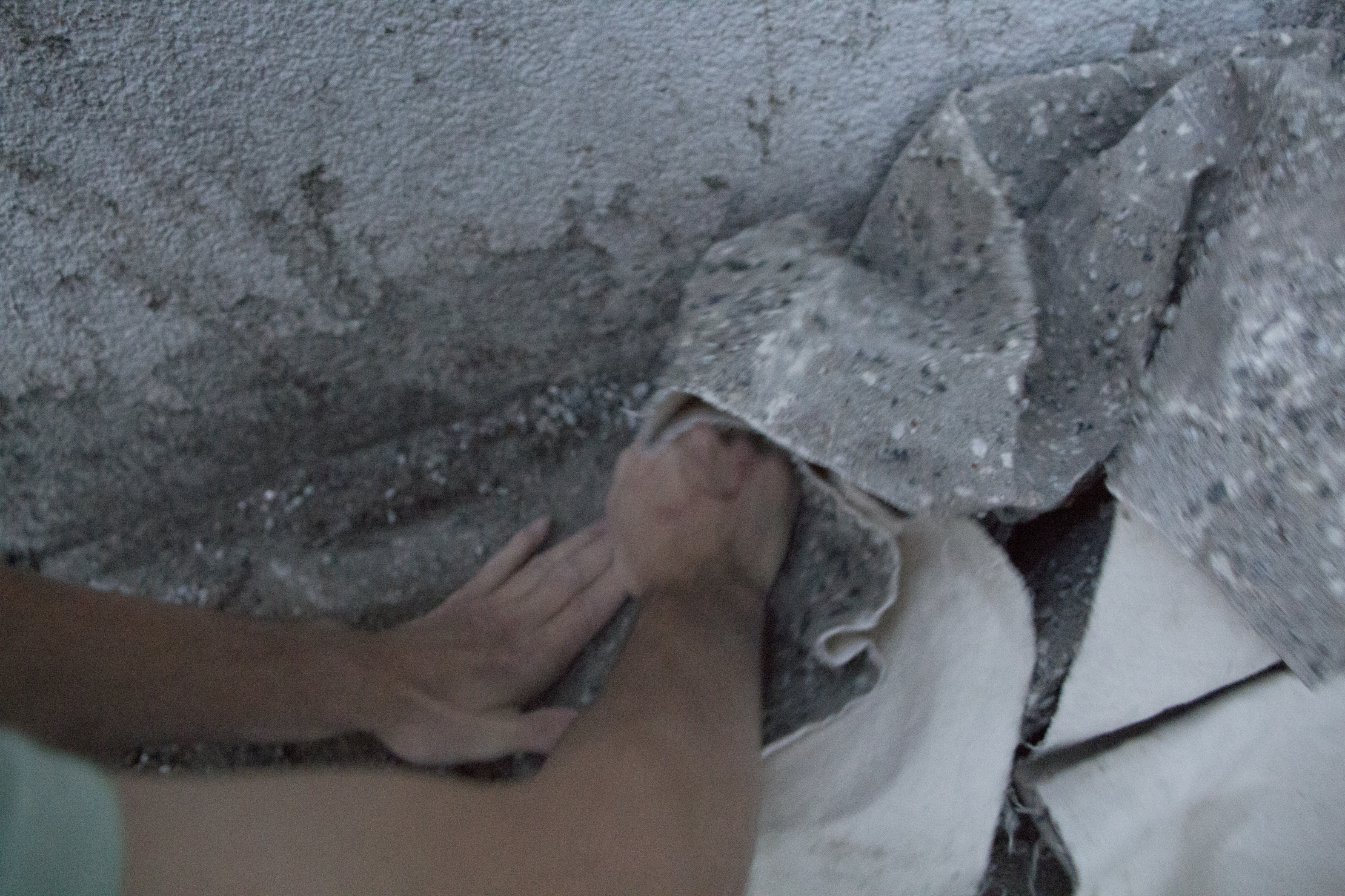 Sans même que personne remarque sa présence, une partie de la fondation s’use. La dalle d’entrée sur laquelle nous marchons pour accéder au 407 de Maisonneuve E se consume au rythme du temps et selon nos passages. Pendant que sa détérioration suit son cours, chaque jour, nous balayons la surface de la dalle. Ainsi amassons-nous, sous forme de granulats et de sable, des quantités importantes de résidus de béton. D’autres matériaux se retrouvent de manière plus éparse parmi notre collecte tels des bouts de bois, de verre, de plastique et de cigarettes. Tout est trié, car trois papiers sablés sont confectionnés à partir des détritus provenant de la dalle mère. Les trois supports mesurent chacun 5 x 8 pieds, soit les dimensions de la dalle. Ils sont taillés dans de la toile de peintre, un produit trouvé en quincaillerie cousu en son milieu suggérant à la fois canevas et matériau de construction.