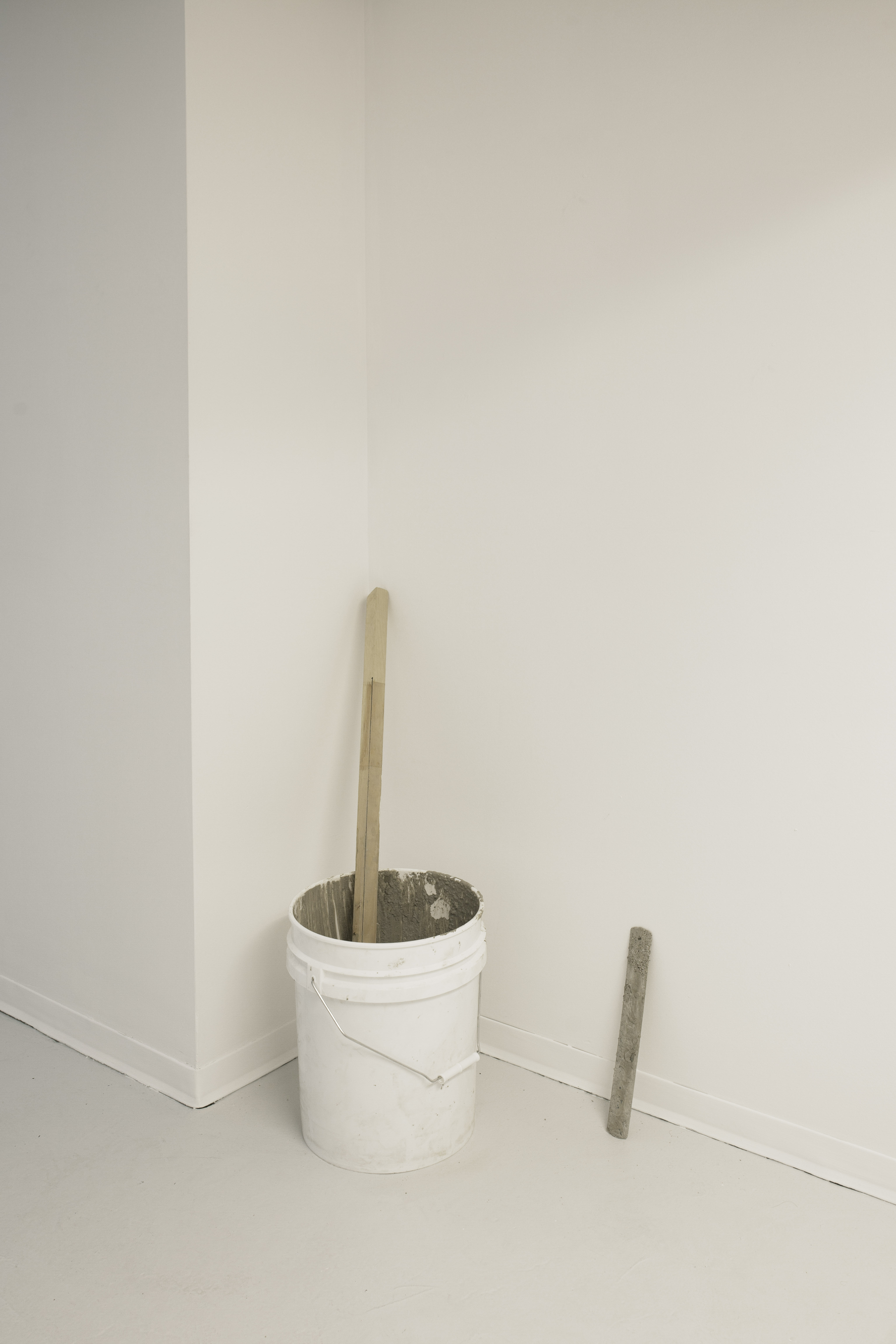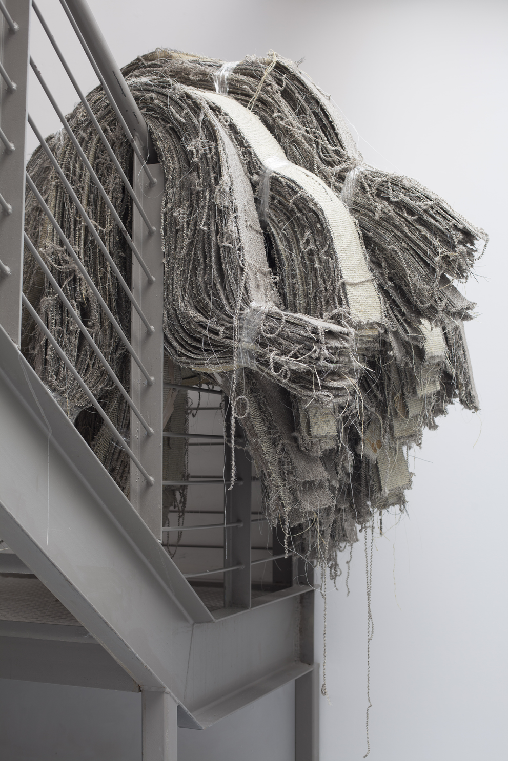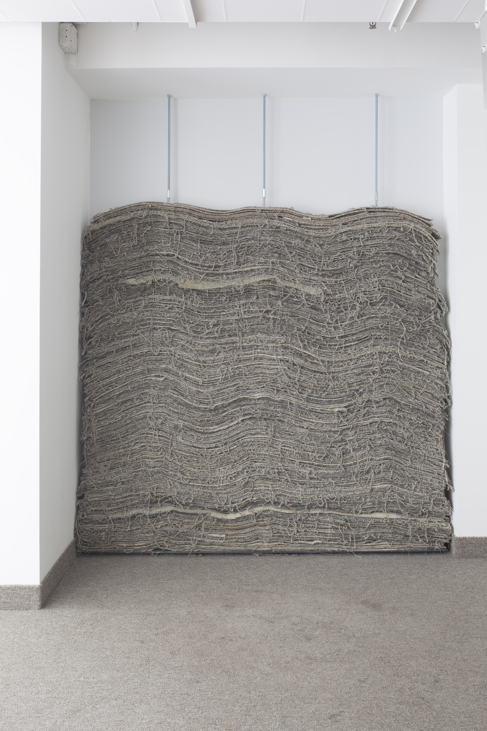 Par le biais de son vécu, le rebut devient un potentiel matériau fertile. Tel un fossile, il est le reflet du milieu duquel il fut extrait. Produit dérivé du revêtement qui a fait son temps dans le lieu, les lanières de tapis que nous accumulons lors du processus de rénovation sont ici superposées en différentes couches successives, faisant ainsi référence au phénomène de sédimentation, un processus par lequel toute matière s’érode en particules et se dépose au sol pour devenir strate. De cette intervention résultent des strates empreintes du lieu et d’une période précise, soit celle comprise entre la pose du tapis et notre occupation.