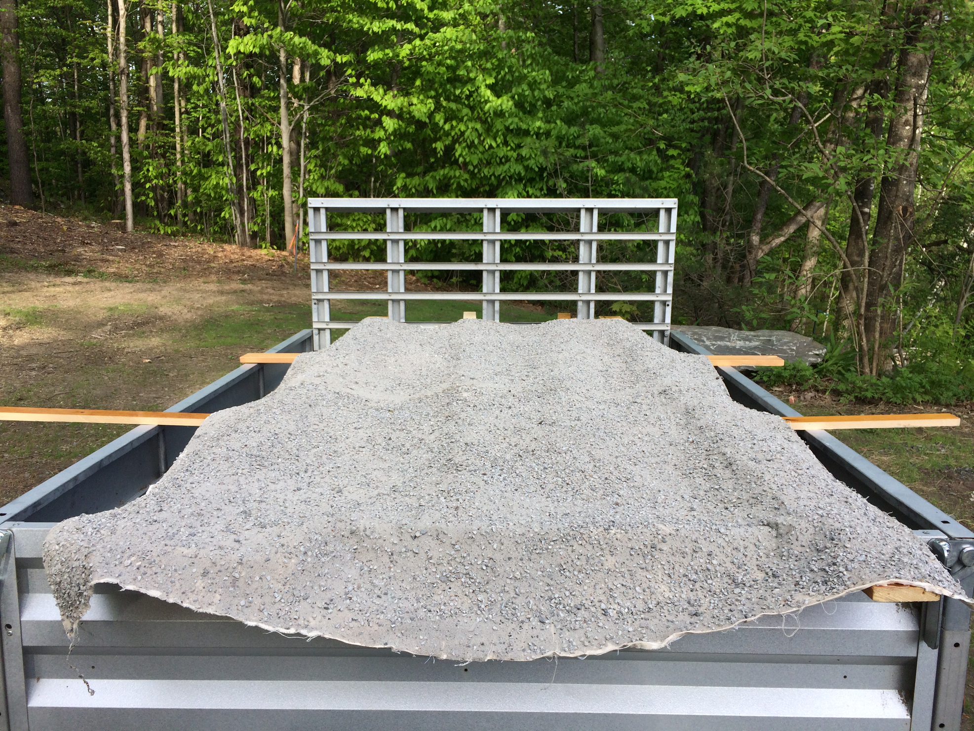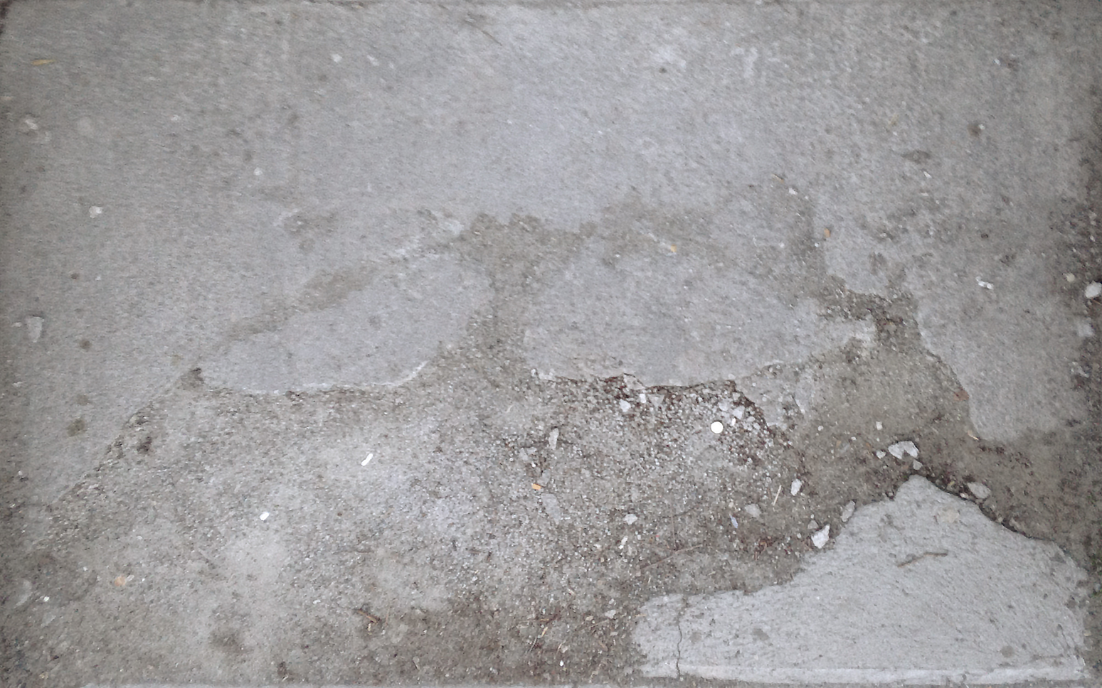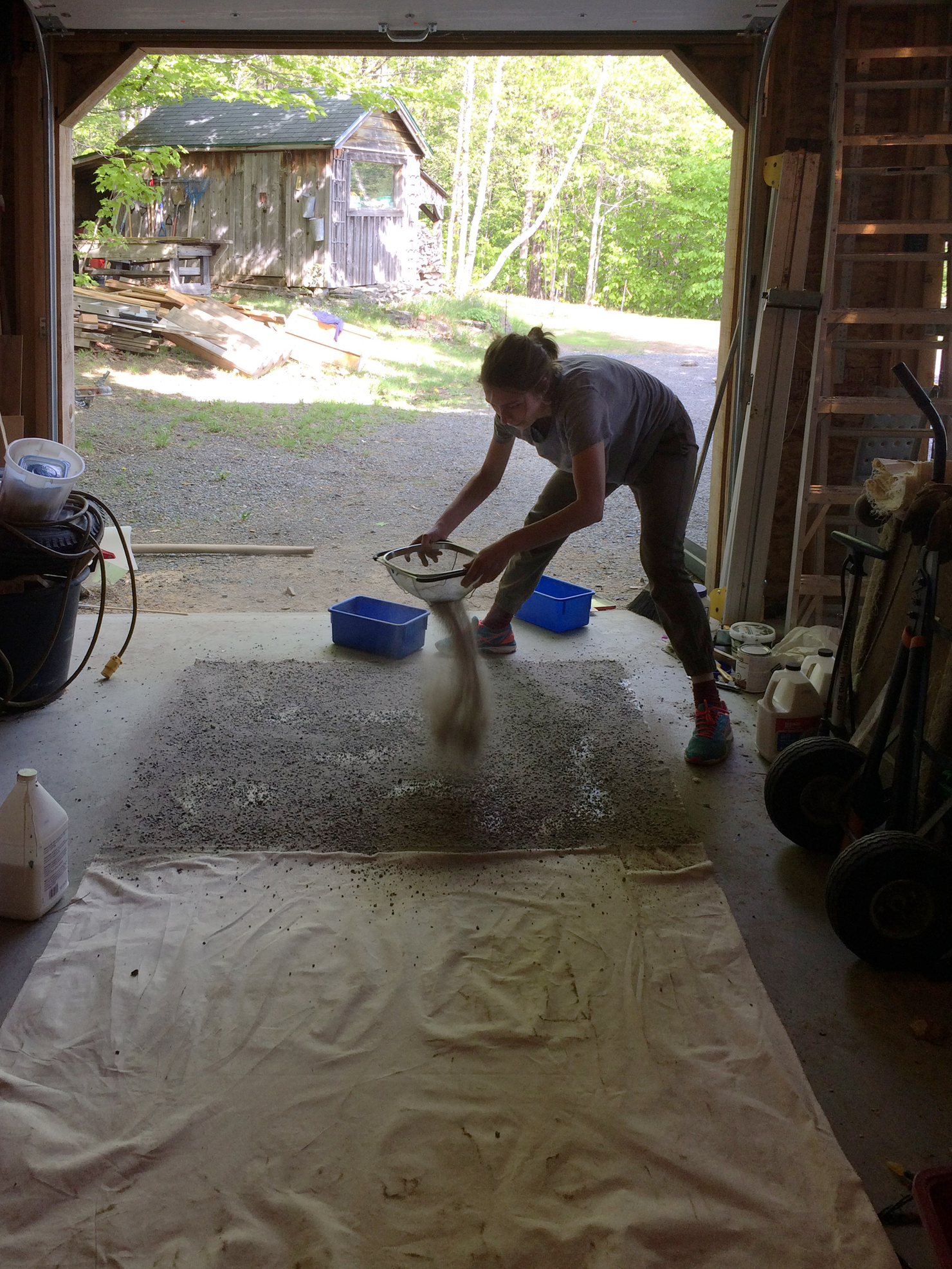 Le balayage quotidien ainsi que les grands sablages auront eu pour effet de mettre en relief l’entrée bétonnée, au sens propre comme au figuré. Il était devenu dangereux de perdre pied, tant les arêtes et les creux de la dalle étaient rendus saillants. L’idée de remplir les trous avec l’excédent de matière accumulé tout au long de notre occupation s’est alors manifestée. Nous avions à notre disposition l’équivalent de 15 litres de gravier et tout autant de sable. Il nous aura suffi de mélanger la quantité nécessaire de ciment, soit 10 litres, pour lier le tout et obtenir un béton de réparation qui soit en mesure de couvrir l’évidure et de survivre à notre passage.