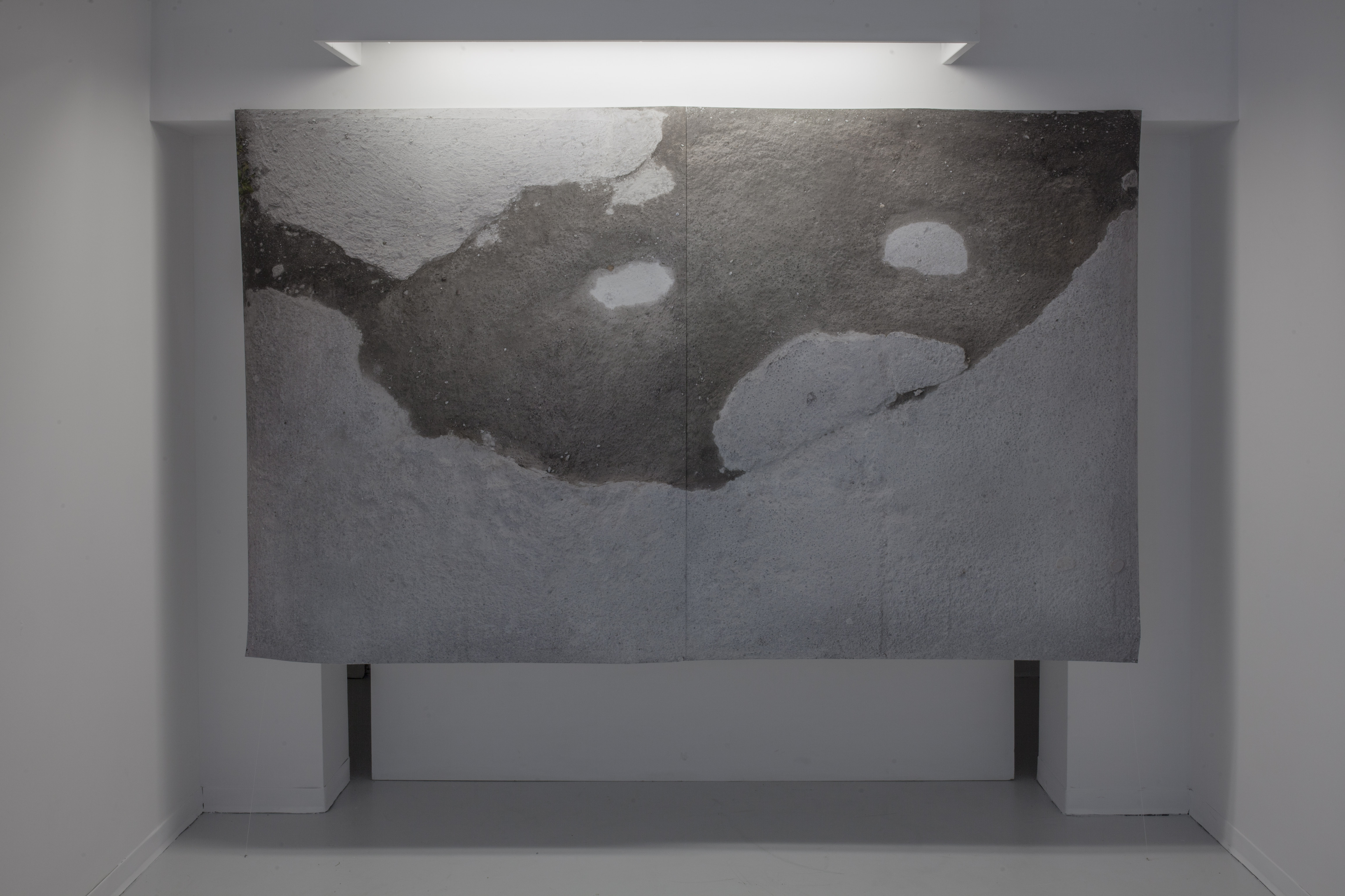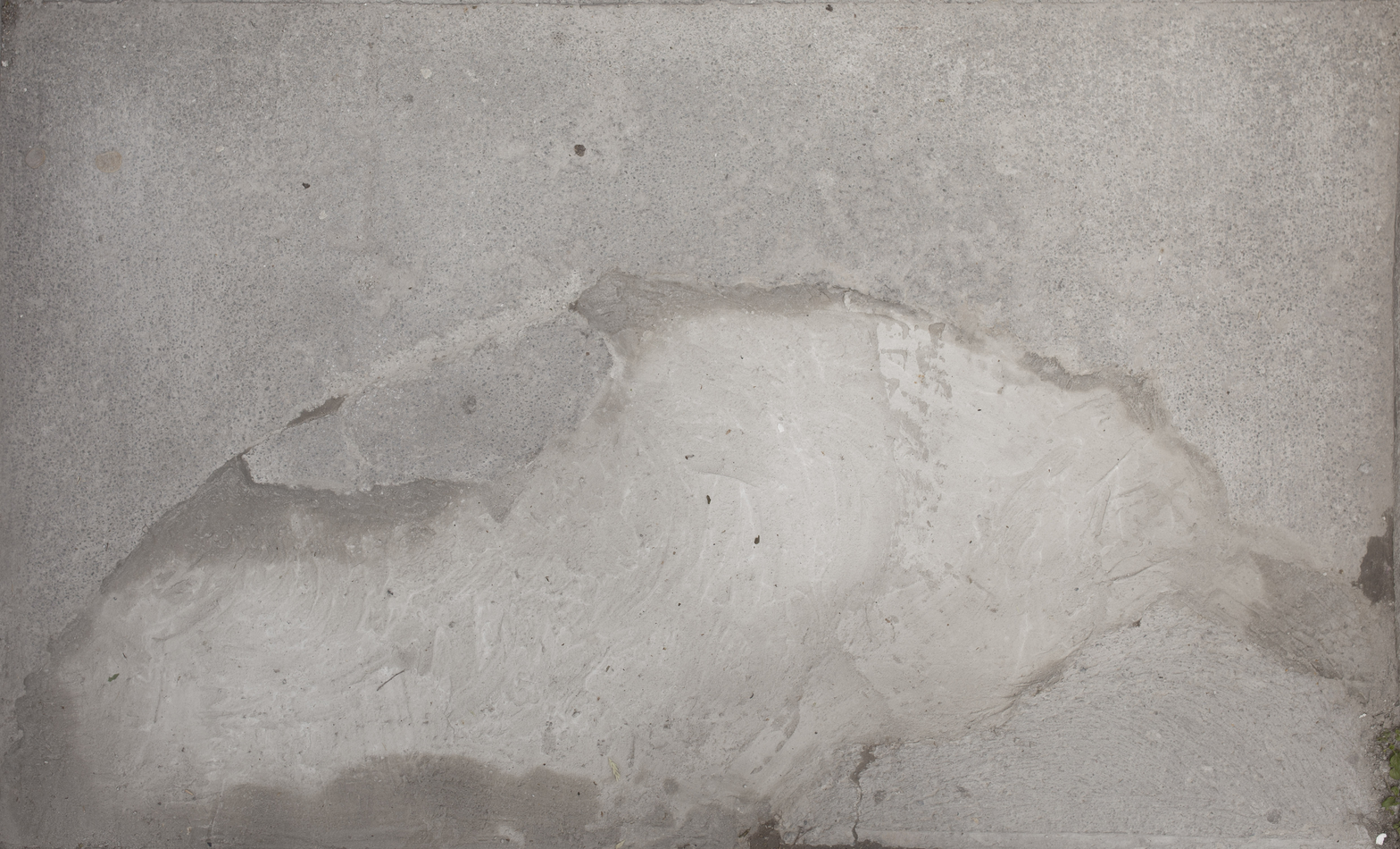 Nous entrons dans la petite salle. Au sol, les restes de l’action sont classés précieusement. L’arrangement, qui n’est pas sans rappeler une forme d’écriture, cohabite avec une impression grand format suspendue et flottante. En raison de la taille, de l’éclairage et de la définition, l’image fait illusion. Elle nous apparaît abstraite et semble être tridimensionnelle, mais il s’agit de la photographie d’archive de la dalle après le troisième passage, juste avant la réparation. Une rotation de 90° ainsi qu’une translation d’un étage par rapport à la matrice ont été effectuées. L’impression est cousue en son centre et imprimée à l’échelle 1 : 1. Le son habite la salle. Lorsqu’on s’approche de l’image, on comprend que l’action résonne encore dans le cagibi, au-delà de l’archive photographique. Face à cette représentation de la dalle d’entrée, orientée de la même manière que la dalle originale que l’on rencontrera en quittant le lieu, la boucle se complète.
