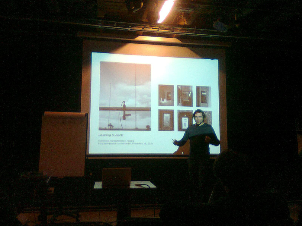 Van Voorst van Beest’s documentary shows that attempts to gain knowledge or insights into sound does not exclusively need to be achieved via acoustical means. Raviv Ganchrow, for his part, argued that epistemologies of sound are related to ontologies of space - a theme touched upon in his art and writings. He stressed the fact that listening is always relative and contextually biased. Furthermore, non-sonic aspects codetermine our listening. Listening subjects, he asserted, are constructed through shifting relations between self and environment, between sonic and non-sonic domains.[7]