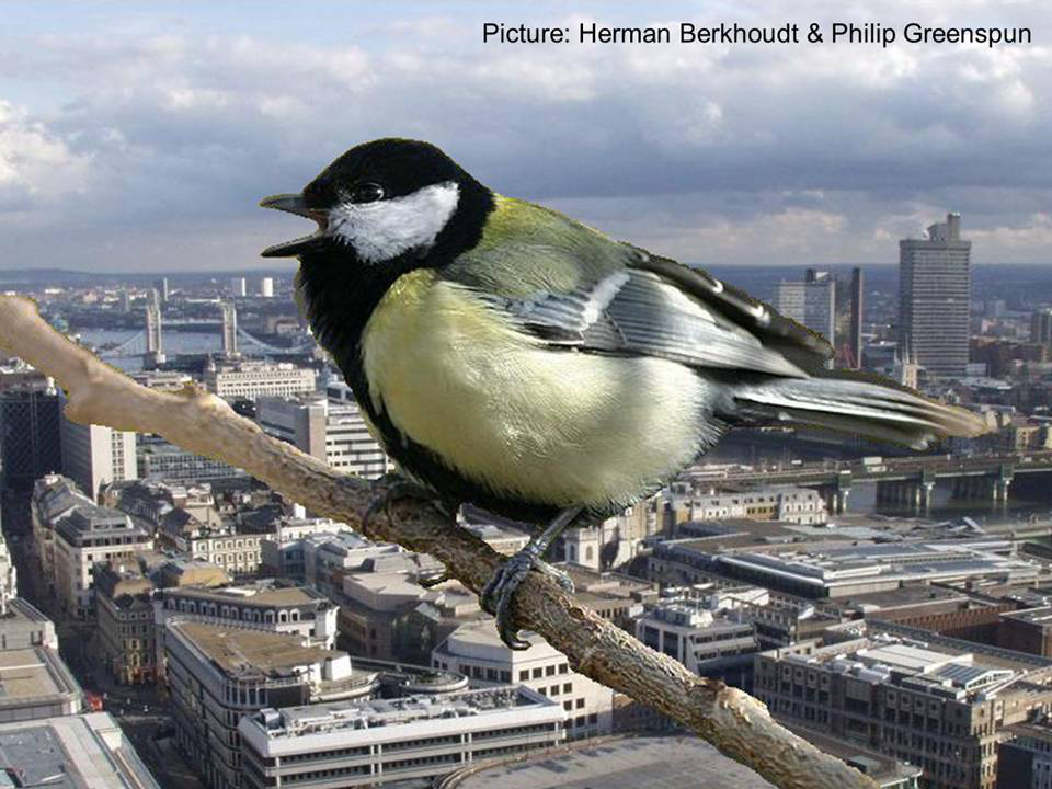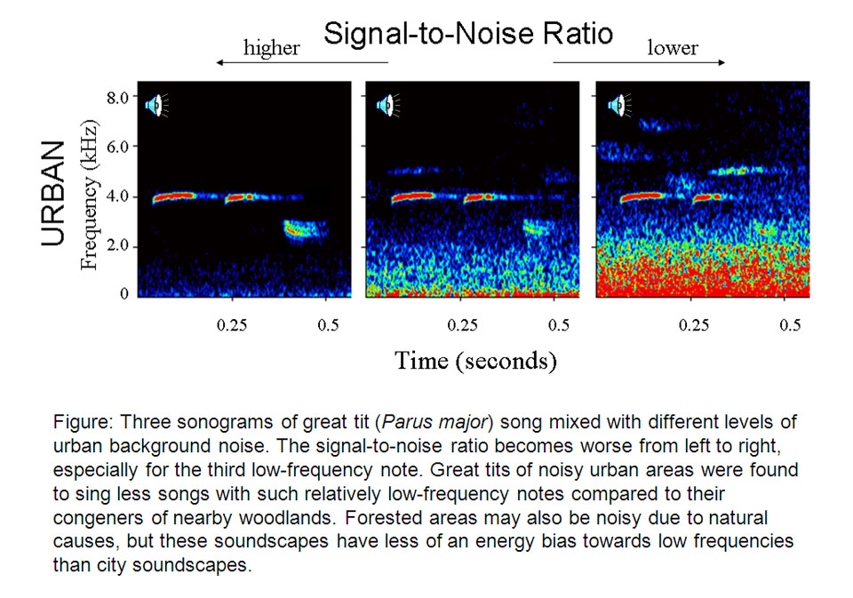 “Urbanized” animals, such as these birds, seem to adapt their acoustic communication to the urban sonic environment they inhabit. These acoustic adjustments could take place at different time scales: immediately in response to fluctuations in noise level, during ontogeny within the life of an individual animal, across multiple generations through evolutionary adaptation, or a combination of these.[4]