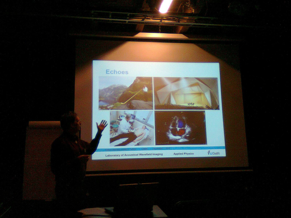 Sound can also establish a relation between invisible spaces and the perceiving subject. Martin Verweij, working on medical acoustical imaging, explained how sonic reverberations – more precisely: ultrasonic echoes – can make invisible spaces visible. Pitches that are present in these echoes are visualized in order to create images of the motion of human organs. In other words, visual information is created out of sounds, enabling the perceiving subject to see what in fact is invisible: our internal bodily space. This is a space that we can hear from the outside: a beating heart, breathing lungs, bowel movements, but which remains invisible to the bare human eye. Sonic reverberation, however, eliminates the physical barriers and opens up this space for visual observation.