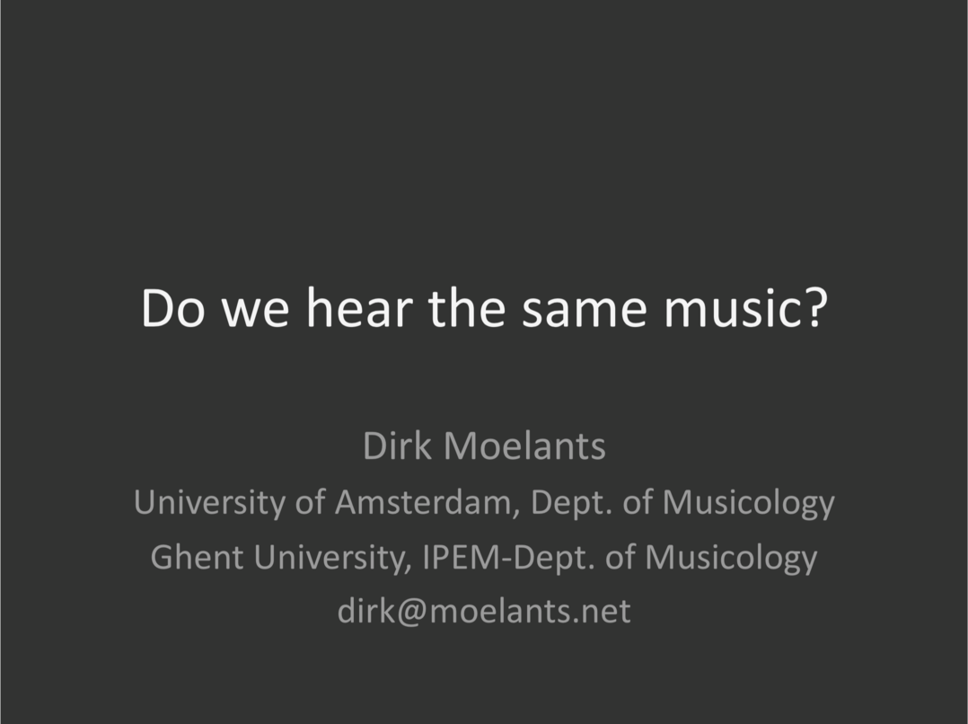 Anne Bolders also discussed the relation between sound and emotion, from a converse point of view. She is interested in the influence of emotion on listening. Bolders claims that emotional states codetermine the way human subjects focus their hearing. According to her research, emotions influence the manner in which human subjects process sound. As an example she discussed how test participants who were brought in a happy or a sad mood interpreted ambiguous melodic lines as either rising or falling, depending on their emotional mental states.[1] This experiment demonstrated that sad participants judged the lines more often as falling than happy ones. While this might not be entirely self-evident (at least not to critical theorists), previous research showed that rising tone sequences are rated as more “happy” than falling sequences (Collier and Hubbard, 2001).[2] The challenges of getting a test participant in a happy or sad mental state and correctly measuring this state raised some questions with several researchers. Emotional associations and/or responses that rising and falling musical melodies might or might not elicit, are forms of musical meaning attribution, a phenomenon that was also addressed by Dirk Moelants. He argued that musical communication is impossible, in the sense that listeners cannot identify the musical intentions of the performer. Listeners do regard music as being expressive, but a performer can never be certain that the message s/he wants to communicate through her/his music will be understood by listeners.[3]