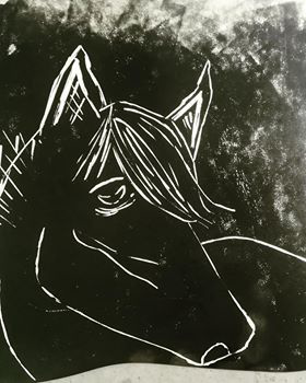 I began my residency by working on a composition entitled The Maghera Pony which itself was inspired by a photograph(pictured). When I began to work on my own prints, subliminally, the image of the horse/ pony kept appearing. This could be read as a response to the landscape in Clare (which indeed does have many horses) and/ or it can be read as part of my own self narrative. As Derrida describes (referencing Kant), when attempting to understand a painting of the horse, 'one must take account of the place of man...as the subject of aesthetic and teleological judgments' (1987: 105).