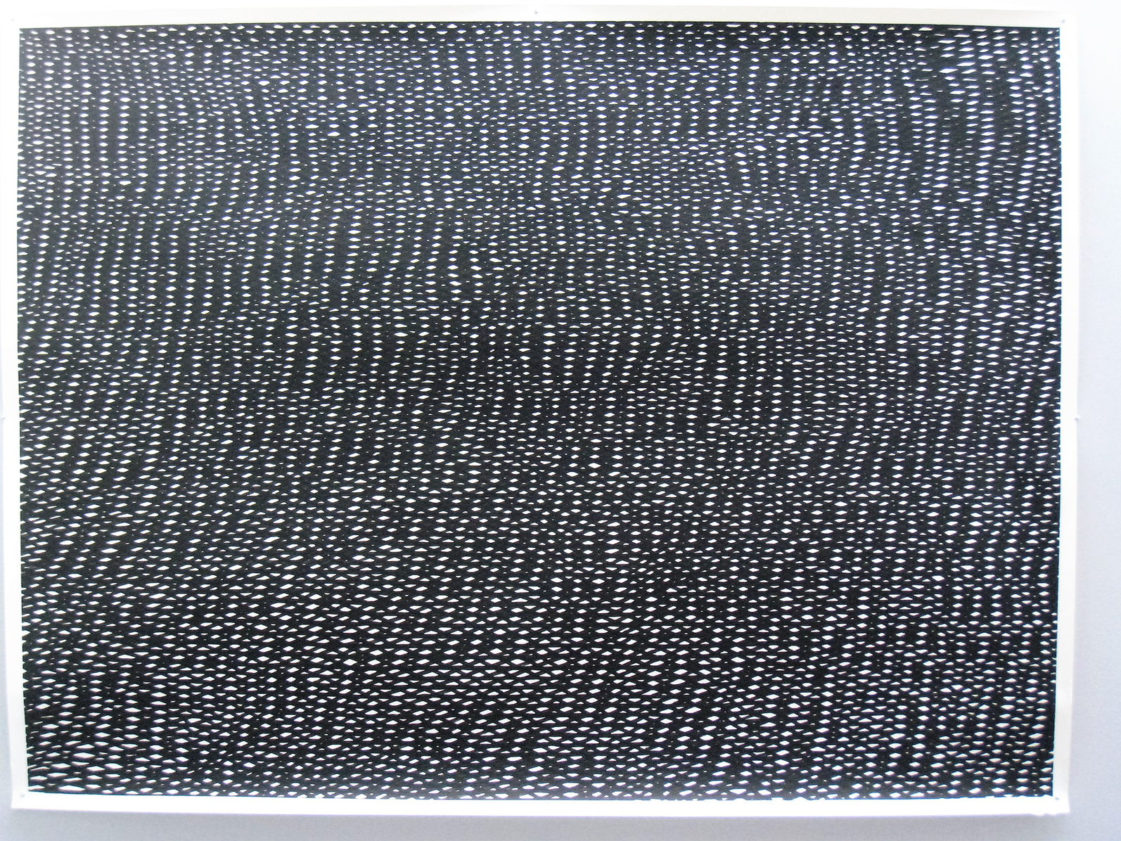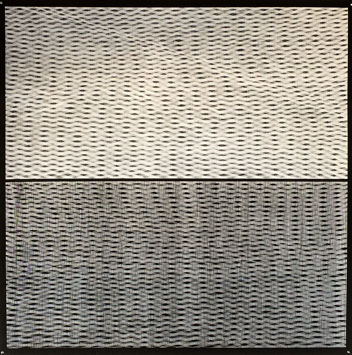 The first piece, Slow Air (Nocturne Beta) is from a series of paintings Tim has undertaken exploring a basic concept of using three diaganol lines repeated ad infinitum to create optical illusions and an over whelming shimmering effect. His pieces, in many ways, refer to the idea of taking a line for a walk. The title Slow air refers to the slow instrumental laments of Irish traditional music.