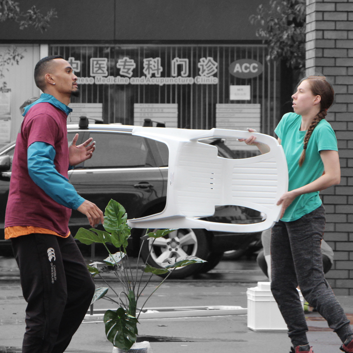 Extra Ordinary Folk was a choreographic response to a deconstruction of social dynamics, using the definitions derived by Pierre Bourdieu throughout his career. A ‘habitus’ was individually interpreted by each performer, bringing together ‘social fields’ of practice or play, and relational ‘capital’, which may be economic, cultural, social or symbolic (Bourdieu, 1989). The public, who were simultaneously passing through the performers' social field, could be said to embody their own habitus. This was acknowledged by the performers through playful and affecting exchanges. External elements such as the architecture and the weather, were also acknowledged through the use of the objects, constantly disrupting and re-negotiating the space. Public space in this case, was a location for private expression, creating collective social dynamics.