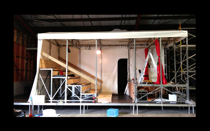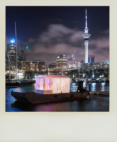 The Floating Theatre is a mobile structure that floats on a barge. Assembled from custom-made steel frame, wooden scaffolding planks and a white PVC skin, the fully functioning theatre seats 30 people. The theatre arrives during the day via the sea and stays moored up to a marina or jetty for the duration of its season. When the theatre is inhabited by the audience during a performance, the interior lighting throws shadows and light projection onto the white walls, exposing all the mechanisms of the theatrical performance and the audience themselves.
