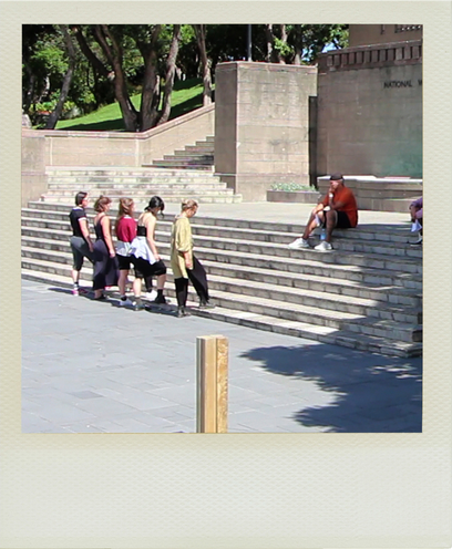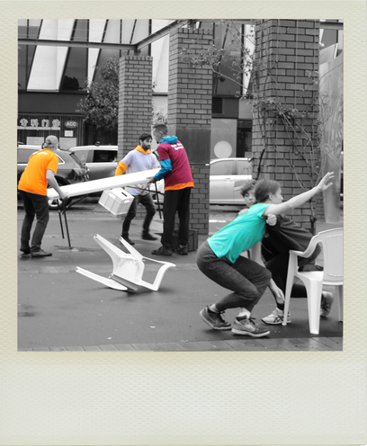 This choreographic group-performance transposes fields of everyday movement onto public space in order to reveal social dynamics. A transitional space in West Auckland links a large suburban mall to a public transport hub, and is occupied by a war memorial that uses the language and scale of civic architecture (standardised materials - bricks, multi-functional, classical proportions) to increase accessibility and add aesthetic qualities. This spatially charged location was negotiated by the local community arts board as the site for a choreography with 7 dancers. In order to further clutter the space we brought a number of mass-produced consumer items sourced from nearby hardware stores; a table, storage boxes, folding chairs, a plastic pot-plant, in order to signify the domestic domain within the civic.
