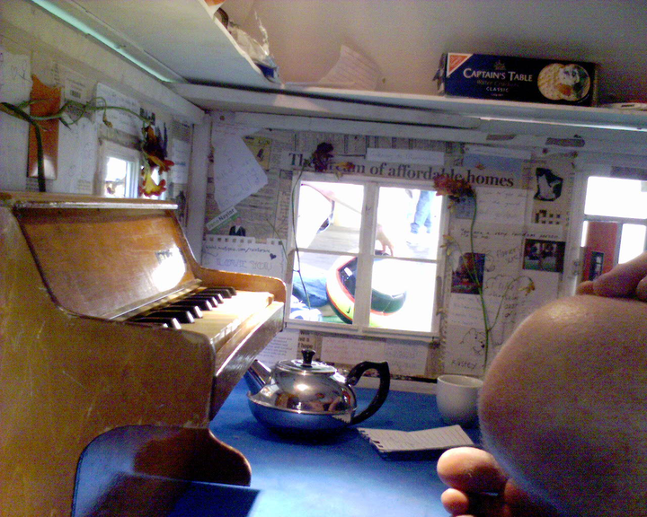 Baby, where are the fine things you promised me? is a mobile performance structure, inside of which the artists lives his normal domestic routines for the course of a day, situated in unlikely urban environments. The model of a Victorian cottage fictionalises a true history (a model of the artist's previously rented home), and allows the public to interact via the ground level windows to the occupant, sharing daily domestic conversation, drinking tea, or sharing music. Placed in busy urban spaces where domestic architecture is largely absent, the little house becomes a beacon symbol of home that elicits public involvement and spontaneous response. Written or drawn notes, either passed through the windows or posted anonymously into the letterbox, play an important role in proximity, allowing different levels of engagement and allowing some distance within a very intimate setting.