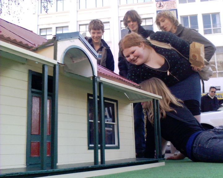 The symbolic home, domestic ritual and intimacy, are forced by miniaturisation to find new meaning in the public realm of the city street, just as the political dimension of inequality is played out by transient populations and poverty stricken people sleeping in the sheltered entranceways to luxury stores. The gigantic human inside the miniature house is a distortion that physically moves the public onto the ground, onto all fours, touching the domestic promise made by previous generations and not passed on.