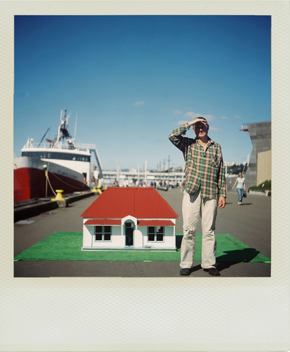 Baby, where are the fine things you promised me? is a mobile performance structure, inside of which the artists lives his normal domestic routines for the course of a day, situated in unlikely urban environments. The model of a Victorian cottage fictionalises a true history (a model of the artist's previously rented home), and allows the public to interact via the ground level windows to the occupant, sharing daily domestic conversation, drinking tea, or sharing music. Placed in busy urban spaces where domestic architecture is largely absent, the little house becomes a beacon symbol of home that elicits public involvement and spontaneous response. Written or drawn notes, either passed through the windows or posted anonymously into the letterbox, play an important role in proximity, allowing different levels of engagement and allowing some distance within a very intimate setting.
