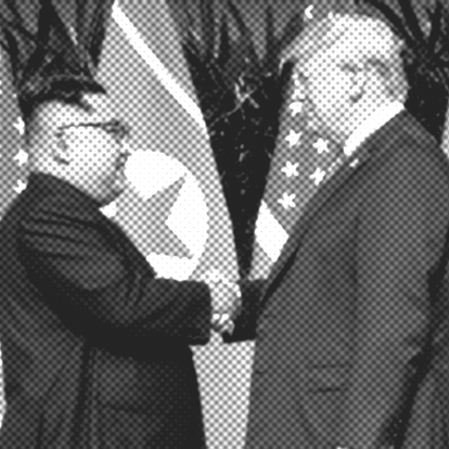 A large desk flanked with American and North Korean flags. The two leaders sit side by side at a table. A leather bound folder sits in front of both of them. The two Leaders, from orthodox East & West, take their pens, and sign the document. Nobody knows what is written in the document, but that they have agreed it is conclusive, they are writing history.