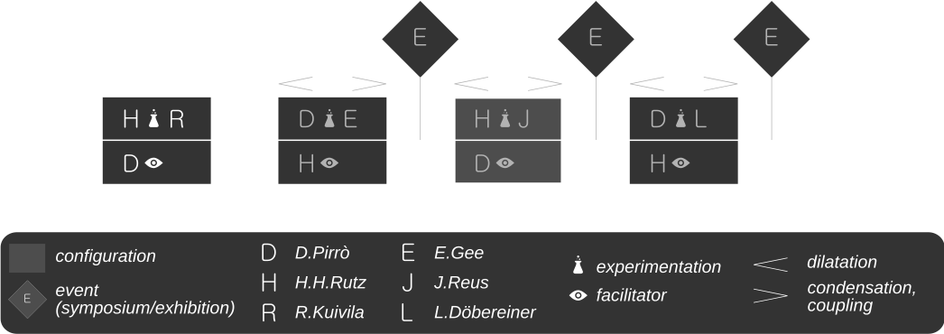 {hhr, 05-Sep-2018} ⁺ The "dilation" and "condensation" bits in the figure indicate an idea that we haven't yet tried out well, so it would be a great opportunity to see if it works. The idea is to structure the residency in a way that we begin from a starting point and then let the process up itself up, letting it grow for a while, develop branches or thicket; and then in the second half to counter-balance the tendency of computational processes to "generate" and "multiply", by defining some strategies for shrinking or "radicalisation" (cutting back to some of the roots, removing materials, etc.). ↗