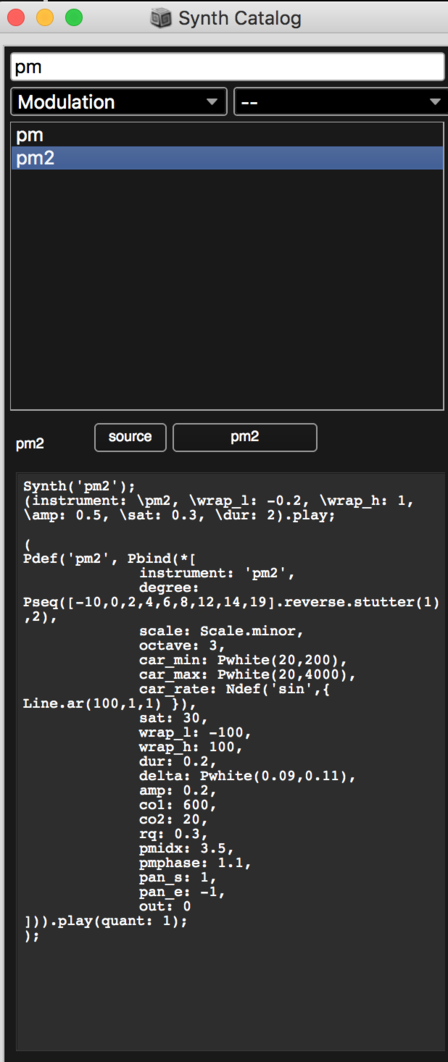 Currently, Jonathan is developing a SuperCollider class called SynthLibrary. This class basically tries to fill the gap between live coding and (out of time) composition. The idea is to have a tool that allows to collect and catalogue synths played during live performances, turning live coding a bit more into a compositional tool and leaving traces of a performance that's very ephemeral. Instead of disappearing jsut after the show, synths are collected in a library and thus can be later reworked and reutilized. The class makes use of metadata to create categories that can be sorted by, like a tagging system - a bit like the dosctring syntax in Java. Then you can search by text, but you can also filter by categories in a non hierarchical fashion. Once a synth is selected you can play its default sounds, examples and view the source code in a separate TextView window.