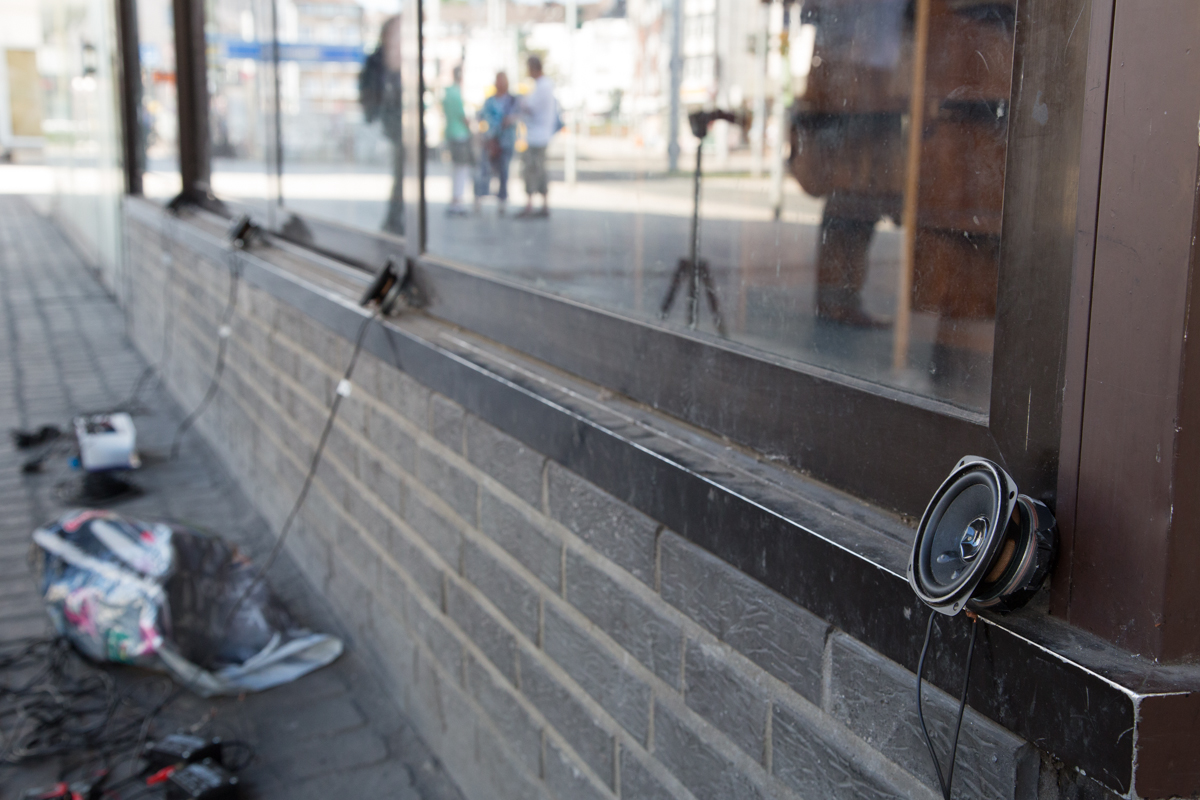 Effect/impressions: The sound for the intervention consisted of samples of original jazz music, overlaid on the four channels. Playing the music from small speakers in an outside space embedded in a soundscape with lots of traffic noise decontextualised it, which made the music appear like abstracted sound material, like a ‘sound object’ in itself, rather than a piece of music with it’s own integrity.