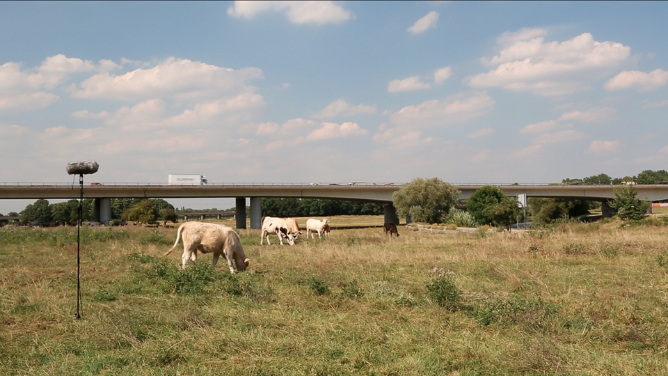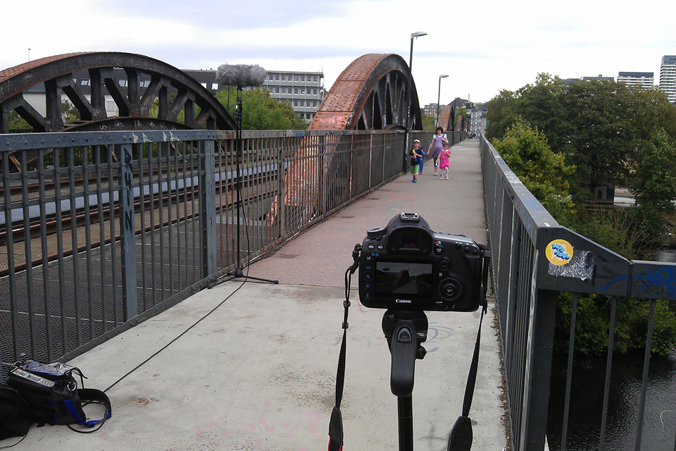 The insights about space and place are multilayered and complex. One aspect that came up repeatedly was the question of the auditory horizon (Ihde 2007), in particular in combination with the visual field-of-view of the video recording and the ability of the surround microphone to capture all around our listening position. Although generally the auditory horizon was much closer than the visual one, mainly because traffic noise blocked out fainter and further-removed sounds, in some quiet places, the opposite was the case. In these quiet urban spots, the ear would not only be capable of perceiving things all around simultaneously, it would also pick up sonic events from much further afield than the eye could. This is particularly true for soundmarks such as church bells and sirens, but it also happened with the cries of a flock of geese flying across the river. We believe that this juxtaposition between the visual and the auditory horizons is perceivable in the screening format we chose, where the image contains less information than the sound. A final interesting discovery about the relation of field recording to a specific place such as Mülheim was that sound recordings tend easily to lose their site-specificity and therefore the intrinsic link to the place of their capture. Only if specific sound icons are captured can a place be recognised through listening alone. The photographic or ‘videographic’ trace can help anchor a recording to an actual place and a memory, rather than an internally constituted one.