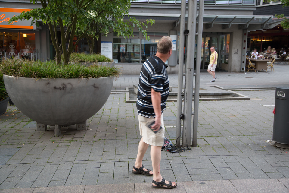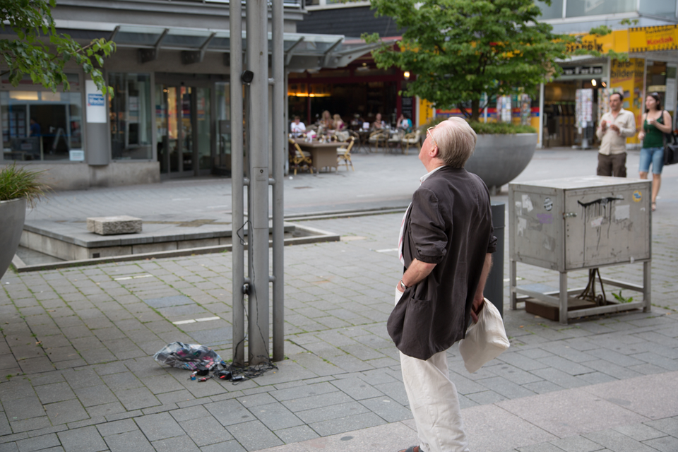 The installation led to a long conversation with a passer-by, who had approached us and asked what we were doing. When we explained, he asked us if we were jazz fans. He was about eighty years old, a retired architect, who had apparently led an exciting, active professional career with many ups and downs. After he was forced to give up his company he had moved to Mülheim. He was well dressed, although in a conservative but slightly dated style, as if he had once been better off – but he showed a cheerful, optimistic attitude throughout the conversation.