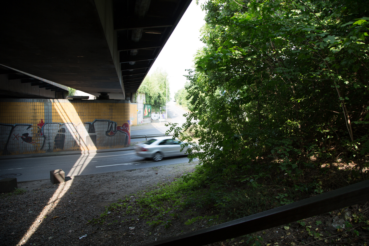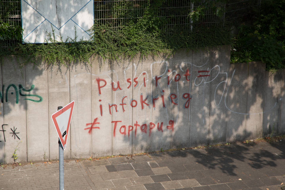 2. Because of the heavy rainfall in the afternoon, we did not realise the plan to place an intervention under a graffiti reading ‘Pussy Riot’ on a wall at Tourainer Ring with sound from the Pussy Riot cathedral performance in Moscow. This would have been another reinstallment of unedited, musical material related to the space in a more abstracted way (name of pedestrian bridge – jazz scene in Mülheim and the Ruhrgebiet in the 1950s; graffiti naming a politically significant performance – recording of that performance).